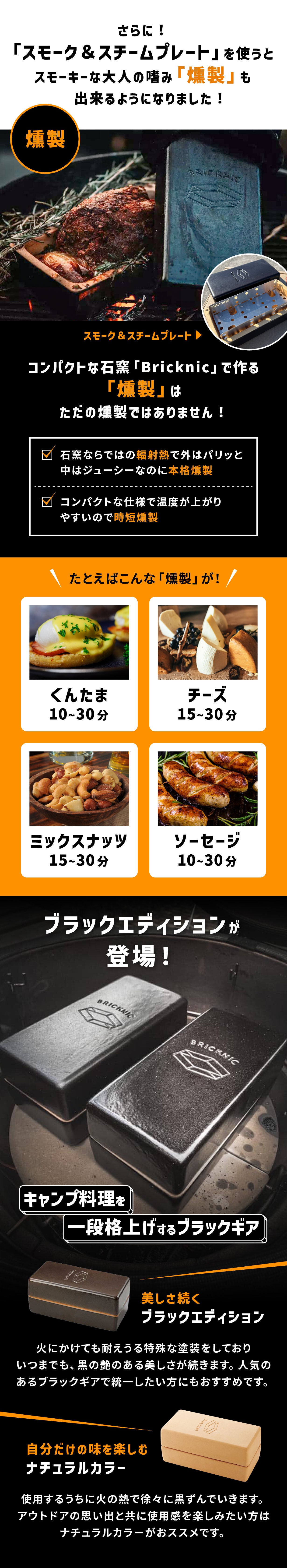 直火、オーブンどちらでもご使用頂けます。直火でも焦げ付きにくいのがBricknicの特徴です。遠赤外線によって素材の味が活きるBBQ飯をぜひご堪能ください。