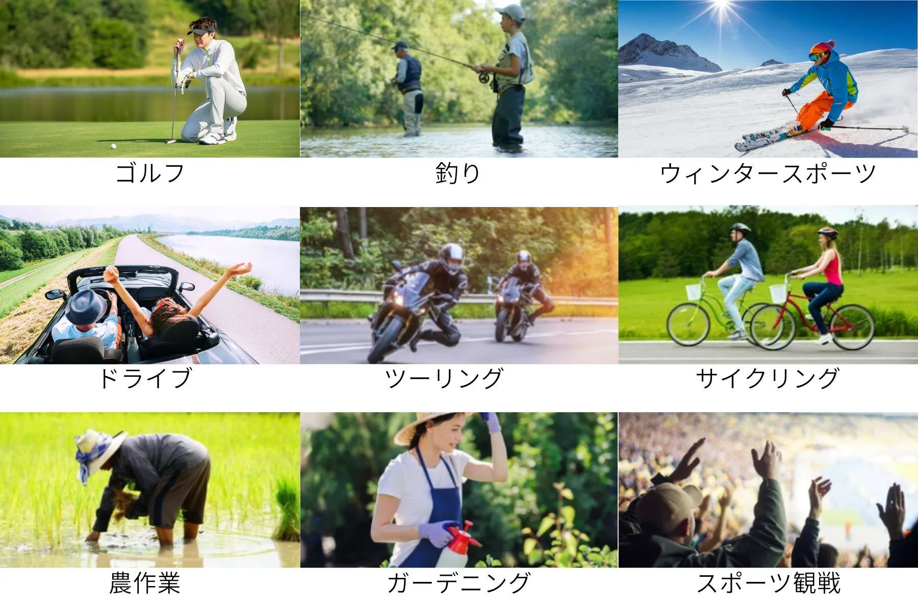 季節を問わず、太陽光の強い日や屋外でのスポーツ、アウトドアシーンで活躍します。お庭でのガーデニングや農作業にもおすすめです。