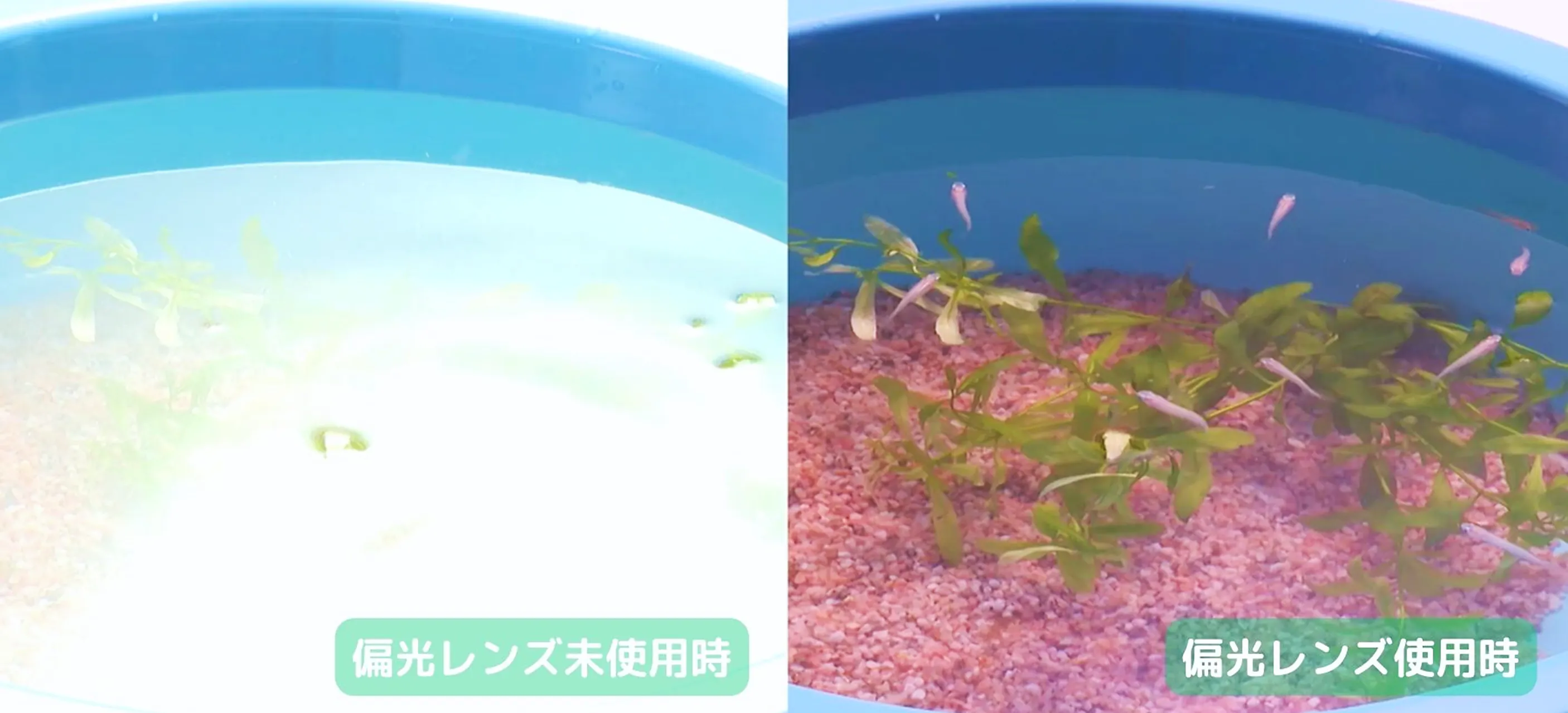 桶に水を張っての比較実験。左の桶の水面が光を反射して白くなっているため底まで見えないのに対し、偏光レンズを通して見た右の桶は底までくっきり見えています。