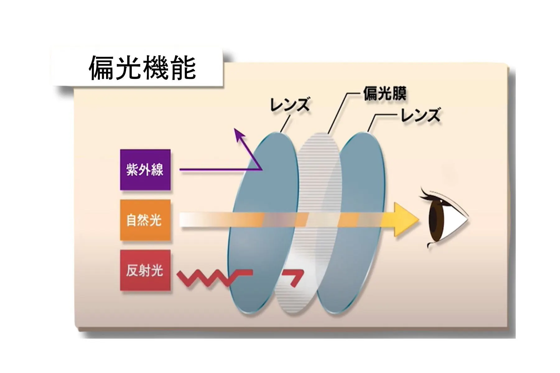 ゴルフや釣り、またドライブやツーリングなどで使用すると、眩しさを軽減して楽に見えるようになる偏光レンズ。日差しの強い日のちょっとした外出でも活躍します。
