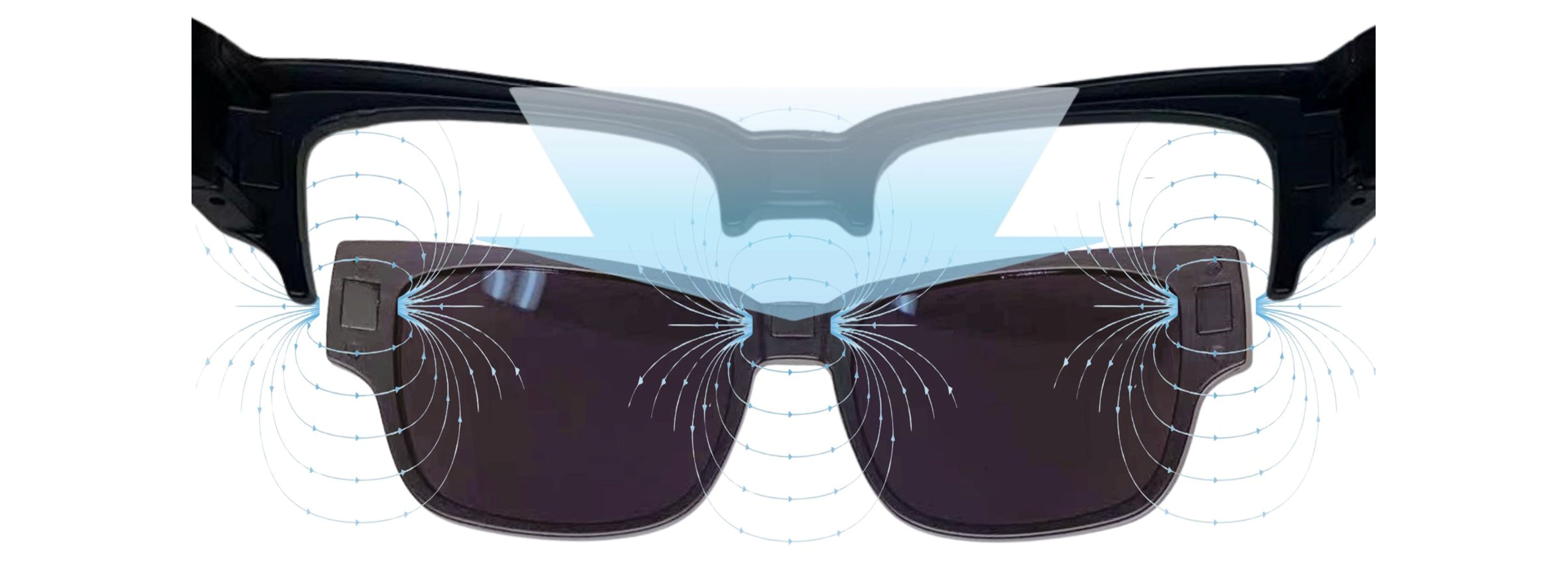 レンズとフレームは3か所のマグネットでしっかり吸着。フレキシブルに調整可能なテンプルで、その時に合わせてぴったりとフィッティングできます。
