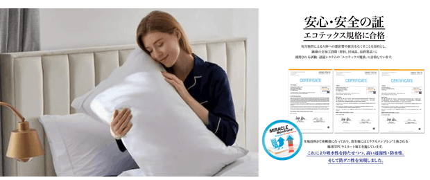 「エコテックス規格」に合格有害物質による人体への悪影響や被害をなくすことを目的とし、繊維の全加工段階(原料、付属品、最終製品)に適用される試験・認証システムの「エコテックス規格」に合格しています。敏感肌の方でもご安心してお使いいただけます。