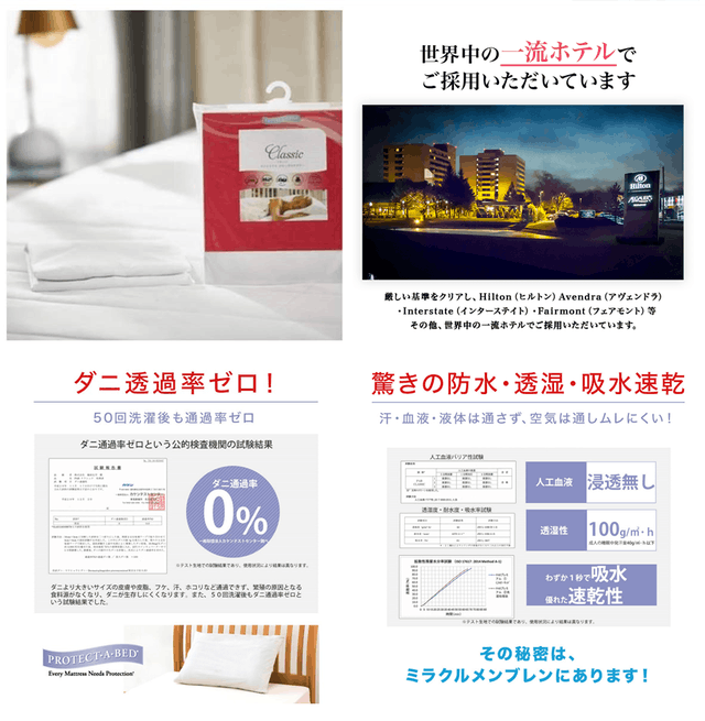 ■世界トップブランド33年以上にわたり45カ国で販売される名実共にトップのマットレスプロテクターブランドです。業務用販売の分野ではヒルトンを始めとする一流ホテルに導入される実績があります。