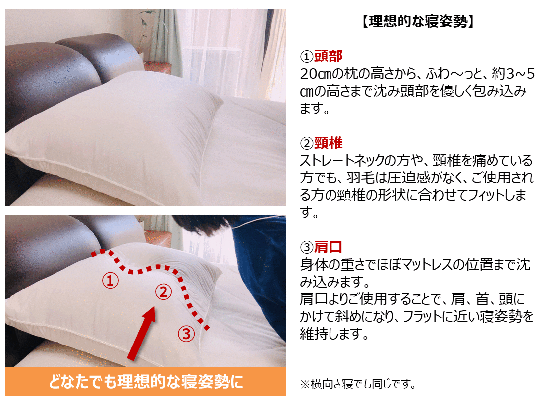 本物の羽毛枕は頭部、頸椎の重量で体圧分散し理想の寝姿勢に導きます。