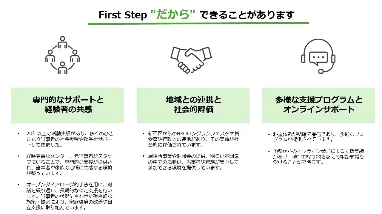 はじめまして。NPO法人First Stepの岩崎と申します。
