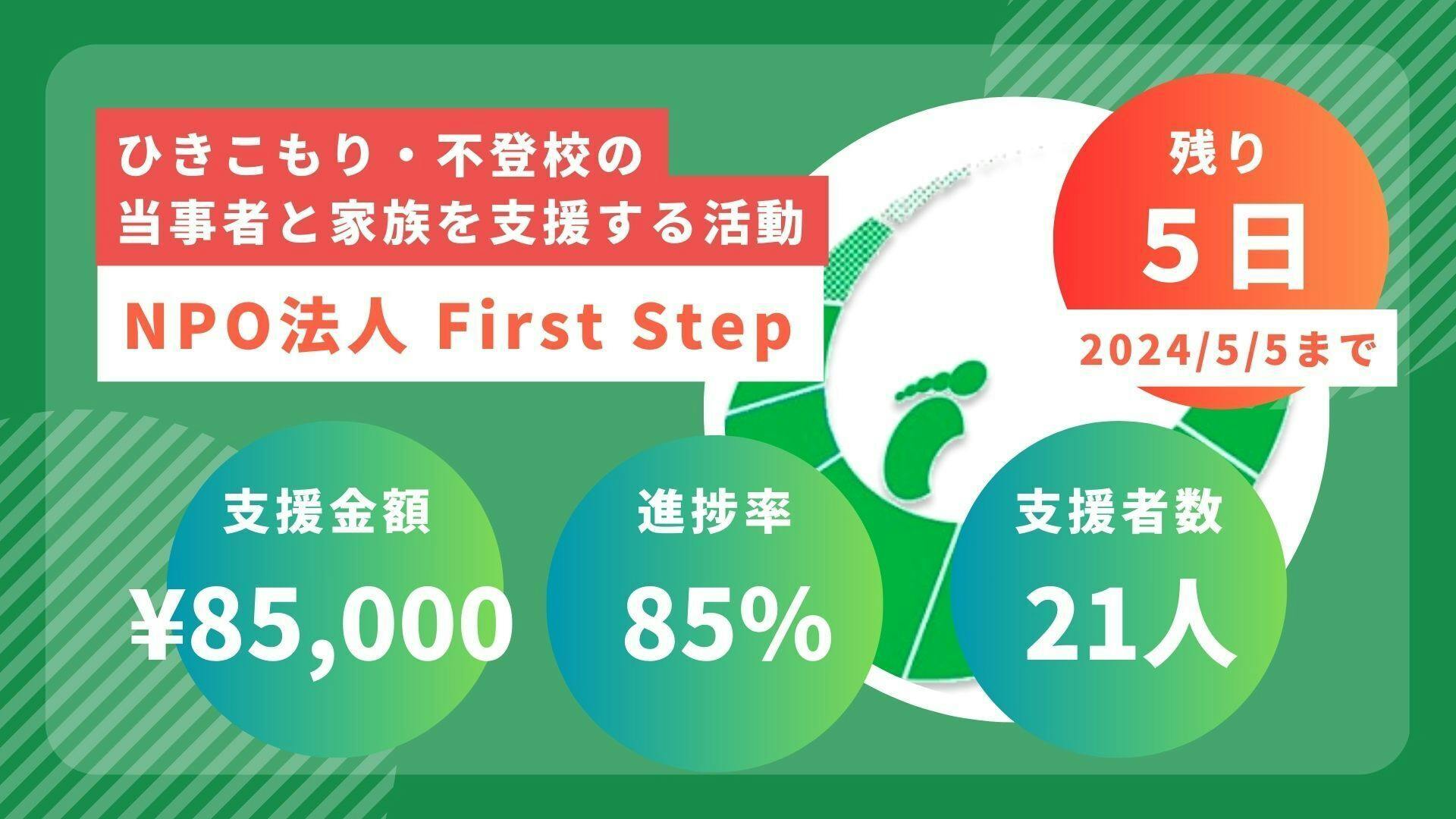 2024/04/30 23:20皆さん、こんにちは!NPO法人First Stepの岩崎です!いつも応援ありがとうございます!みなさまの温かいご支援のおかげで、目標金額の80%を突破しました!本当にありがとうございます!皆さまからいただいたご支援金で、フライヤーを作成し、ひきこもりの問題を多くの人にお届けするという目的の達成まで、あと一歩です!引き続きシェアなどご支援のほどよろしくお願いいたします!さて、今回のクラウドファンディングですが、NPO法人「二枚目の名刺」のサポートプロジェクトによる支援を受けて実施しています。そのサポートプロジェクトメンバーたちの声をFirst StepのFacebookページにて掲載しています。彼らがなぜ私たちを支援するに至ったか、そして実際に支援してみて感じたFirst Stepの印象など、赤裸々に語ってくれています。ぜひ彼らの思いにも一度触れてみてください。https://www.facebook.com/npo.firststep今回のプロジェクトも残り5日となりました。目標達成に向けて最後まで諦めずに走り抜けたいと思います!引き続き、みなさまのお知り合いやコミュニティにも拡散いただけますと、とても喜びます!引き続きご支援のほどよろしくお願いいたします!【クラファンページ】https://camp-fire.jp/projects/view/756389?utm_campaign=cp_sp_share_c_msg_projects_showお知り合いやコミュニティに拡散される際は、下記の紹介文をご活用ください!ーーーー紹介文ーーーー初めまして! NPO法人First Stepの岩崎と申します。私たちは「ひきこもり・不登校の当事者の苦しみを根本的になくす」ことをミッションに、不登校・ひきこもりの親(家族)の相談事業に力点を置いて、東京都新宿区を中心に当事者の自立を支援しています。ひきこもりは、長らく「親の育て方の問題、仕事もしない怠け者」であるとして安易な自己責任論、家族責任論として社会的偏見の中で放置され、結果的に問題をこじらせてしまい、ひきこもりが長期化し、もはや社会復帰をしたくてもできないという人たちが溢れている社会状況にあります。私達は世間という砂の中に埋もれて見えなくなってしまった人々をなんとか掘り起こし、救いたいと考えています。そして今回、我々の団体のこと、そしてこの問題を広く知ってもらうためのフライヤー制作費用を集めるためのクラウドファンディングにチャレンジしております!クラウドファンディングはフライヤー制作のため、という目的もありますが、クラウドファンディングを通じて、「ひきこもり」の問題について知ってもらいたいという気持ちが強いです!悩んでいる当事者とその家族だけではなく、周囲の人がひきこもりに対しての理解を深めていくことで、助けを求めやすい環境や、支援の輪を広げていくことを目指しています。もしよろしければ、皆さんの周りのコミュニティやお知り合いの方にシェアいただけますと幸いです!【クラファンページ】https://camp-fire.jp/projects/view/756389?utm_campaign=cp_sp_share_c_msg_projects_showどうぞ応援のほどよろしくお願いいたします!!! もっと見る