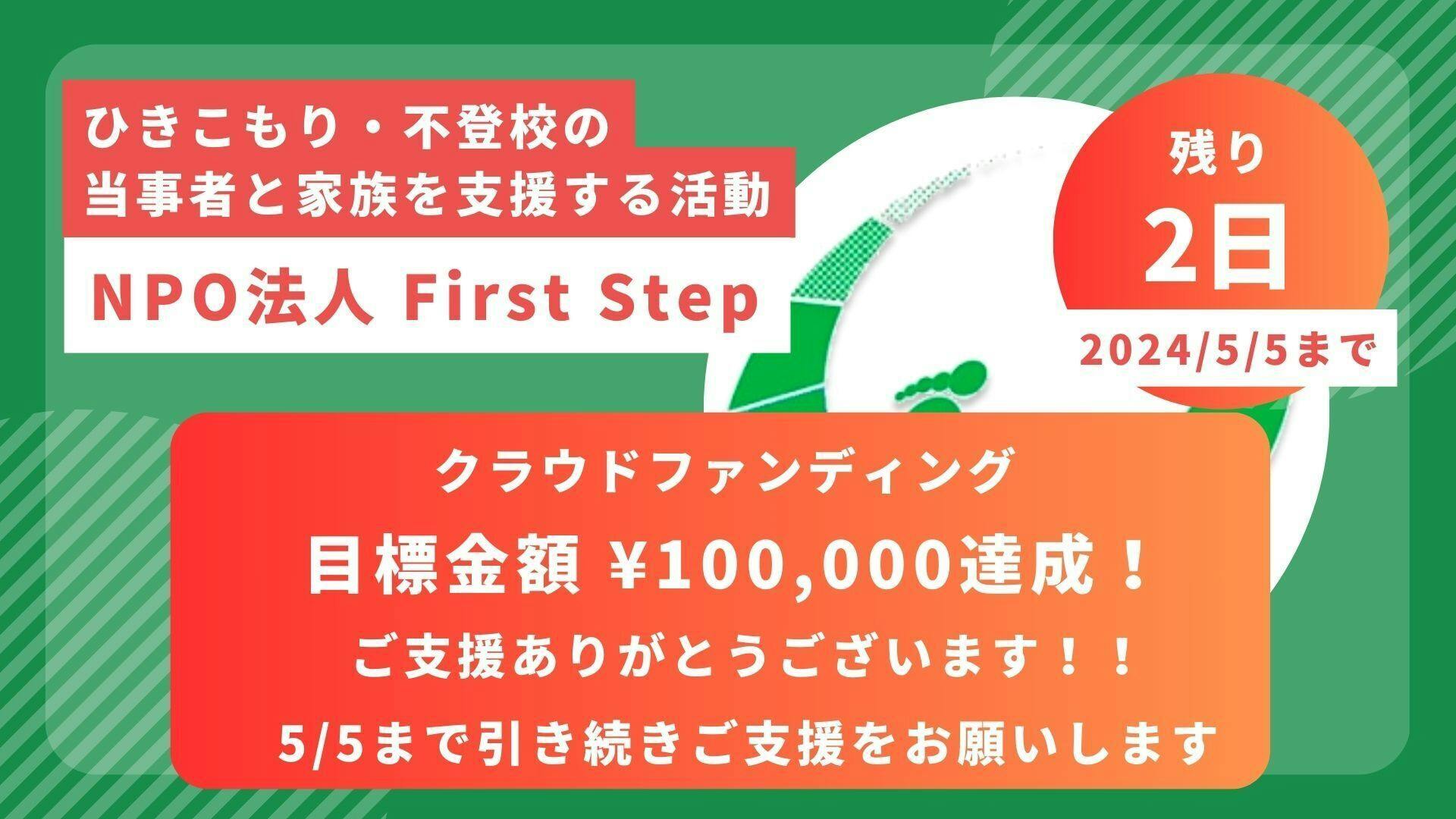 2024/05/02 17:51NPO法人First Stepの岩崎です。ついに目標金額100,000円を突破いたしました!!皆さまのたくさんのご支援のおかげで、目標金額に到達することができました。金額達成はもちろんですが、5/2時点で25人もの方にご支援をいただけたことが大変感激です。ひきこもりの問題について広く知ってもらいたいという思いで、プロジェクトを立ち上げましたが、多くの方に受け止めていただきました。ご支援まではいかなくても、このプロジェクトを多くの方に見に来ていただき、そして25人の方にご支援いただけたというのは感謝のほかありません。目標金額は達成しましたが、プロジェクトは5月5日まであります。より多くの方に届けていくため、支援が増えれば増えるほど私たちの思いや活動を遠くに届けることができます。ゴールデンウィークの真っただ中、お休みの方もお勤めの方もいらっしゃることと存じますが、最後の2日間、シェア、ご紹介等ご支援をいただけますと幸いです。何卒よろしくお願い申し上げます!【クラファンページ】https://camp-fire.jp/projects/view/756389?utm_campaign=cp_sp_share_c_msg_projects_show活動報告用(目標達成と残り2日).jpg camp-fire.jpひきこもり・不登校のことをより多くの人に伝えたいNPO法人First Stepは、ひきこもり・不登校の当事者支援を行っています。今や社会全体で取り組みが必要な「ひきこもり」について、当事者だけではなく多くの人により知ってもらうため、フライヤー制作のプロジェクトを立ち上げました。 (64 kB) もっと見る
