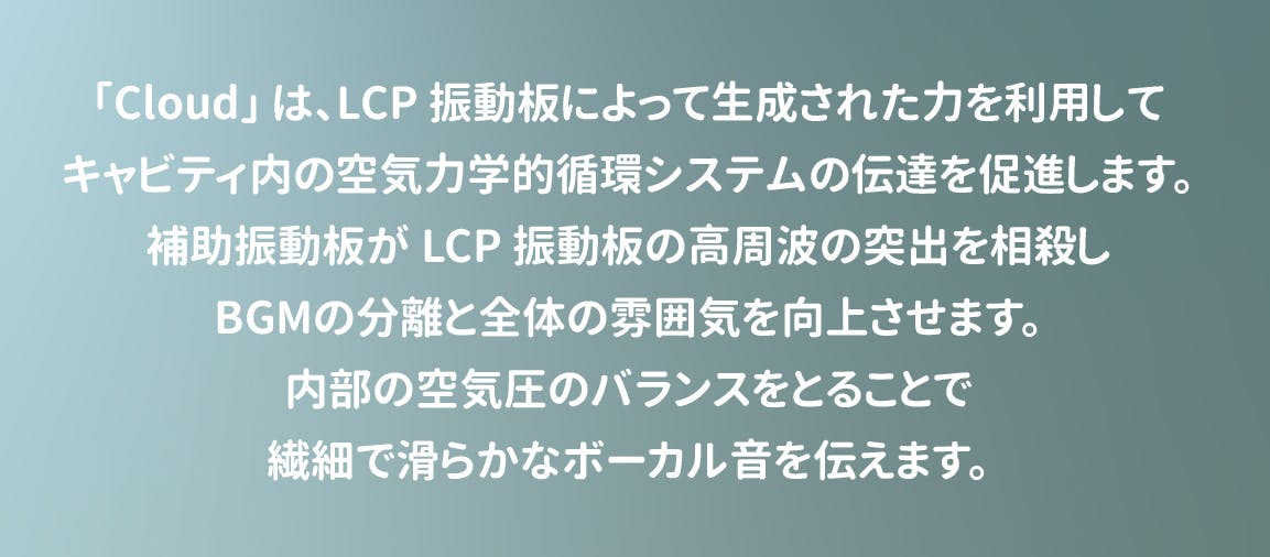 2023年には中低域に特化したコイル式骨伝導ドライバーを搭載した「Wind」で大変好評をいただきました。そして2024年、ウェザーシリーズ第二弾として新たな技術「エアーアシスト振動板」を搭載した「Cloud」が完成しました。