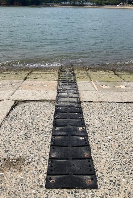 それは福岡県にあるヨットハーバーとのことで、さっそく視察に行ってみました。確かに滑べり防止マットが敷かれていて、効果があるようでした。(当社の製品ではありません)