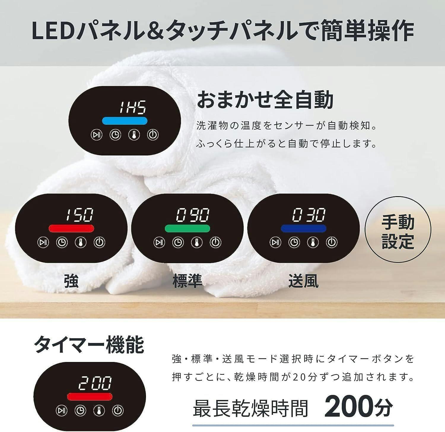 全自動モード、強、中、弱モード、タイマーモード(最大200分)タイマー設定(最長200分・20分単位)も可能なため計画的に乾燥させることも可能です。
