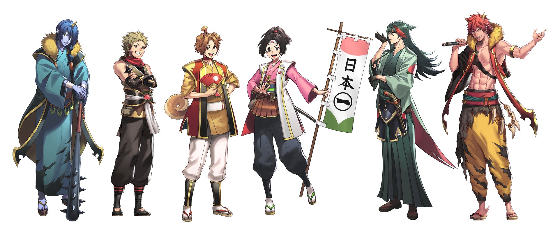 イヌ=戌一(いぬい)、サル=猿炎(えんえん)、キジ=蒼雉(そうじ)、赤おに=紅(べに)、青おに=青玉(あおぎ)