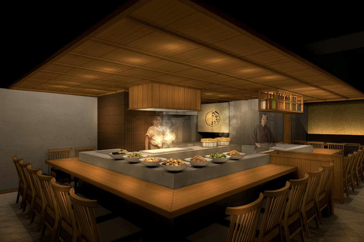中心部にはフルオープンのキッチンスペースとカウンター席。1人の時はもちろん、グループで来てもカウンターを狙いたくなる贅沢な空間です。また、団体様が安心してお食事できる宴会席もご用意していますので、さまざまなシーンでお楽しみいただけます。