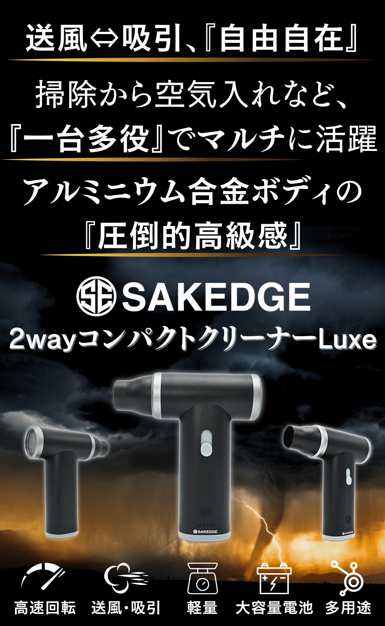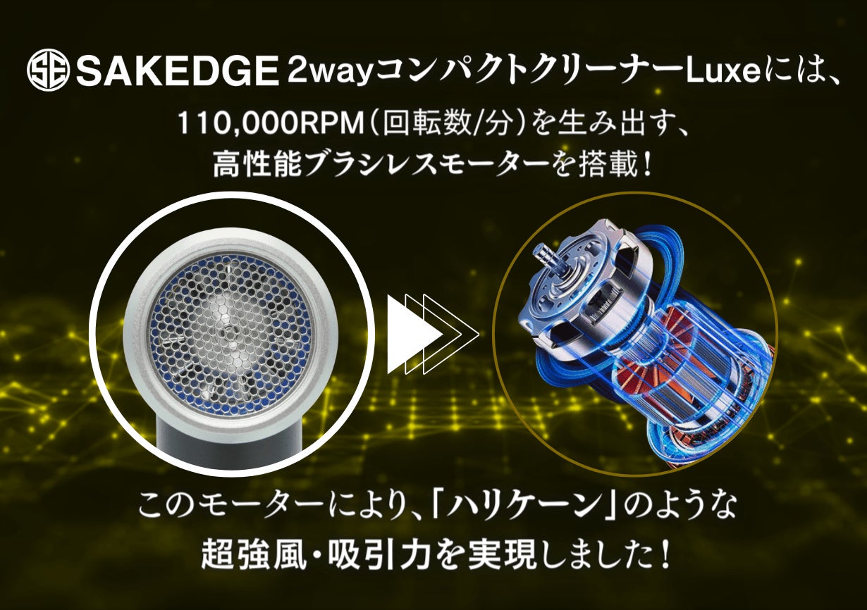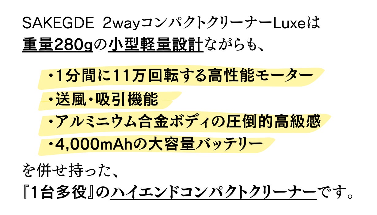 110,000RPMを生み出す高性能モーター、送風・吸引の2way機能、アルミニウム合金の高級感、大容量バッテリーを併せ持った「SAKEGDE 2wayコンパクトクリーナーLuxe」。