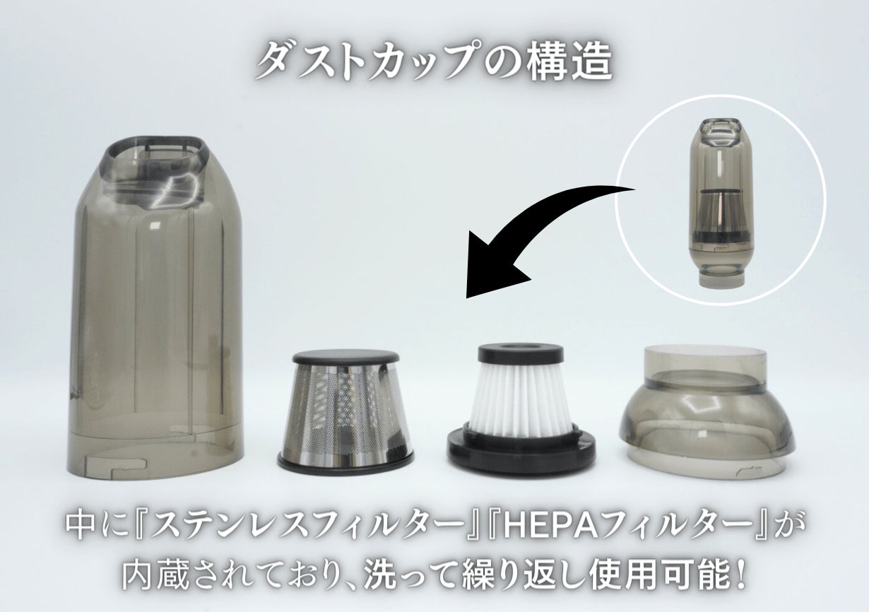 実は本商品、以前プロジェクトを行い大変ご好評をいただいた「SAKEDGE 2wayコンパクトクリーナー」の外装をアルミニウム合金製にし、アタッチメントについてもダストカップの機能を強化したモデルとなります。