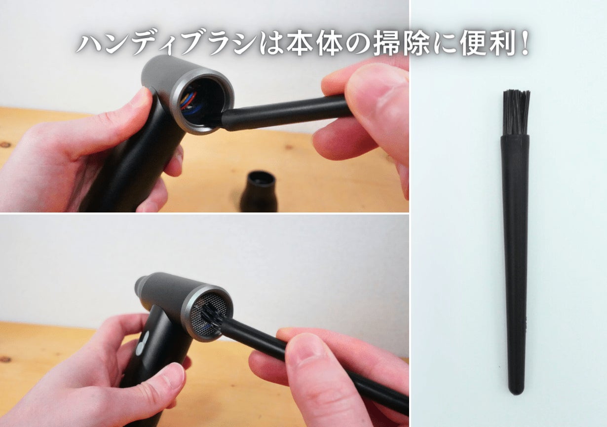 また今回は付属品として皆さまの作業が捗るよう、3種類のブラシ(うち1本は本体などの掃除用)と本体・付属品を一緒に持ち歩ける専用ポーチをご用意いたしました!