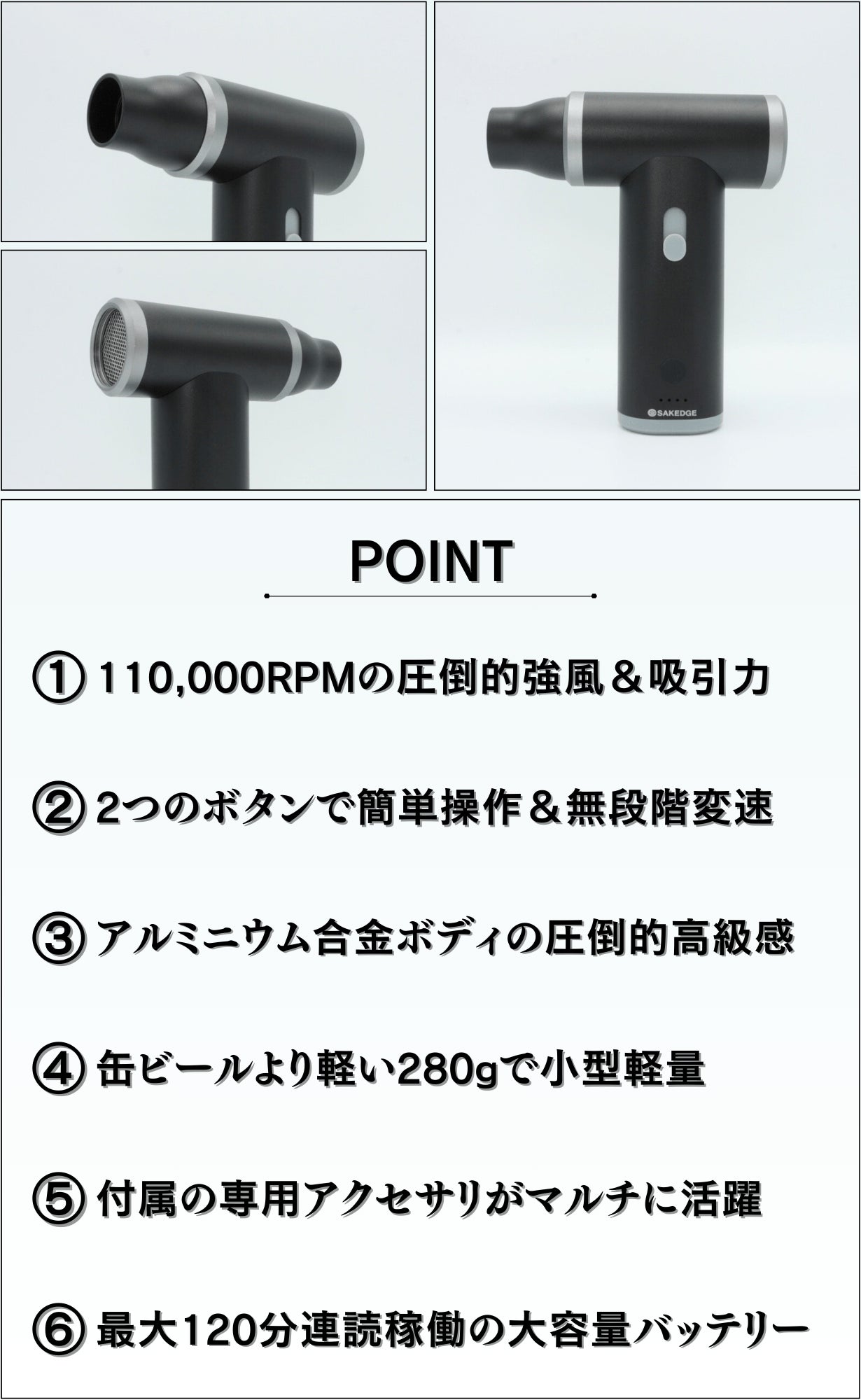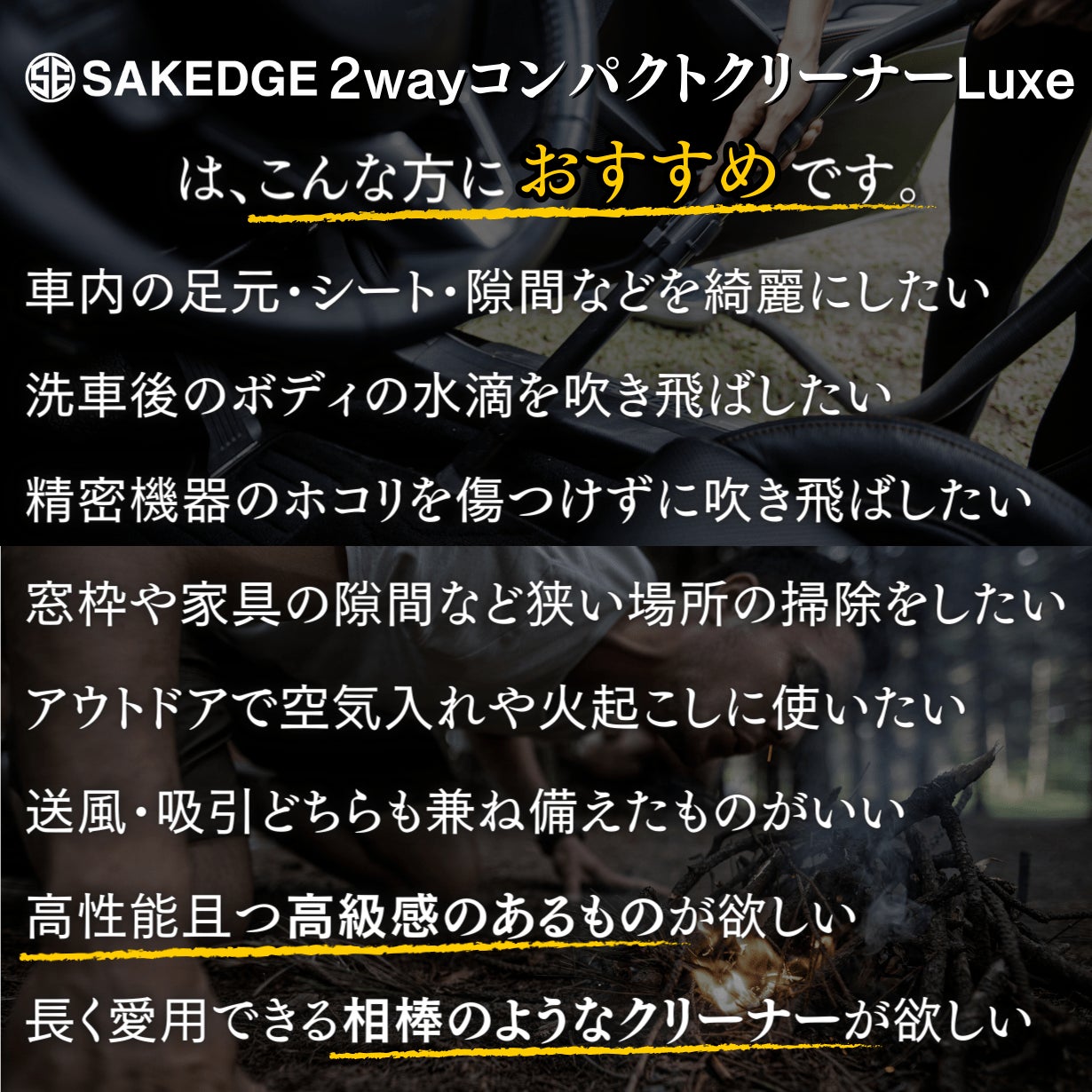 今回お届けする「SAKEDGE 2wayコンパクトクリーナーLuxe」は、お家や車内の細かい掃除や、洗車後の水滴飛ばし、空気入れなどが簡単にでき、尚且つ見た目の高級感のある製品を探し求め出会った出来上がった商品です。