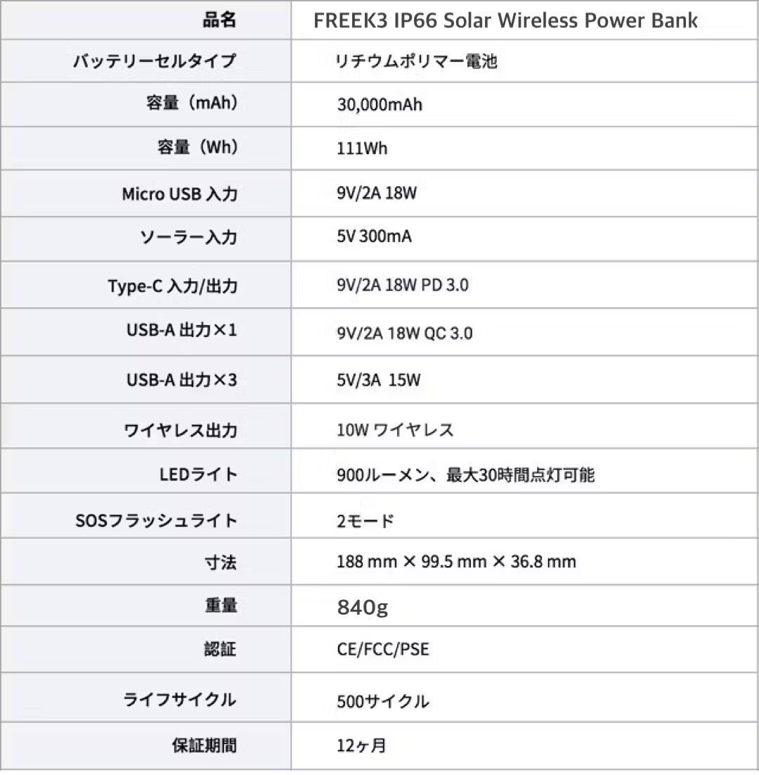 Q: 本体のソーラーパネルを利用して太陽光で本体を充電するにはどれくらいの時間がかかりますか?A:FREEK3は容量が30,000mAh(111Wh)もあるため、太陽光のみでフルチャージするには、かなりの時間がかかってしまいます。ご家庭でのUSB充電を推奨いたします。もっとも、太陽光だけでも、LEDライト分の電力は発電できます。