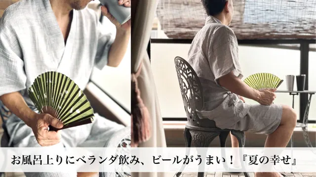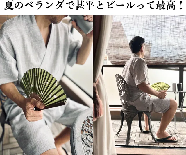 夏のベランダでビールを飲みながら甚平を着るのは、とても涼しくて気持ちが良いですね。部屋着としてリラックスできるのも良いですね。