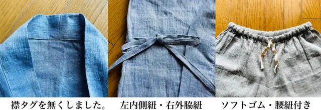 何度も試着を繰り返し、生地が決まり、夏の涼しげで上品な色が決まり、外出着として粋なデザインが決まりました。サイズ感は実際に着用していただき動作のチェック(歩く・走る・座る・立ち上がる)睡眠時の着用動作をチェック(寝返りの際にはだける度合い)などを繰り返し決まりました。
