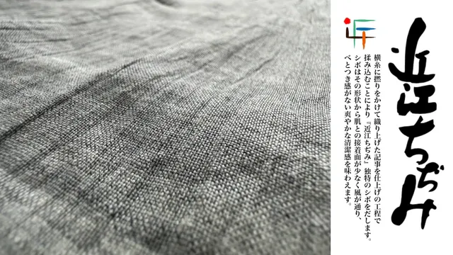 伝統の技法によって製織された近江ちぢみの生地に、昔ながらの匠の技と新しい技術を使って作り出された「しぼ」加工品です。その独特の凹凸で肌への接触面を少なくし、シャリ感のある抜群の肌触りが得られます。