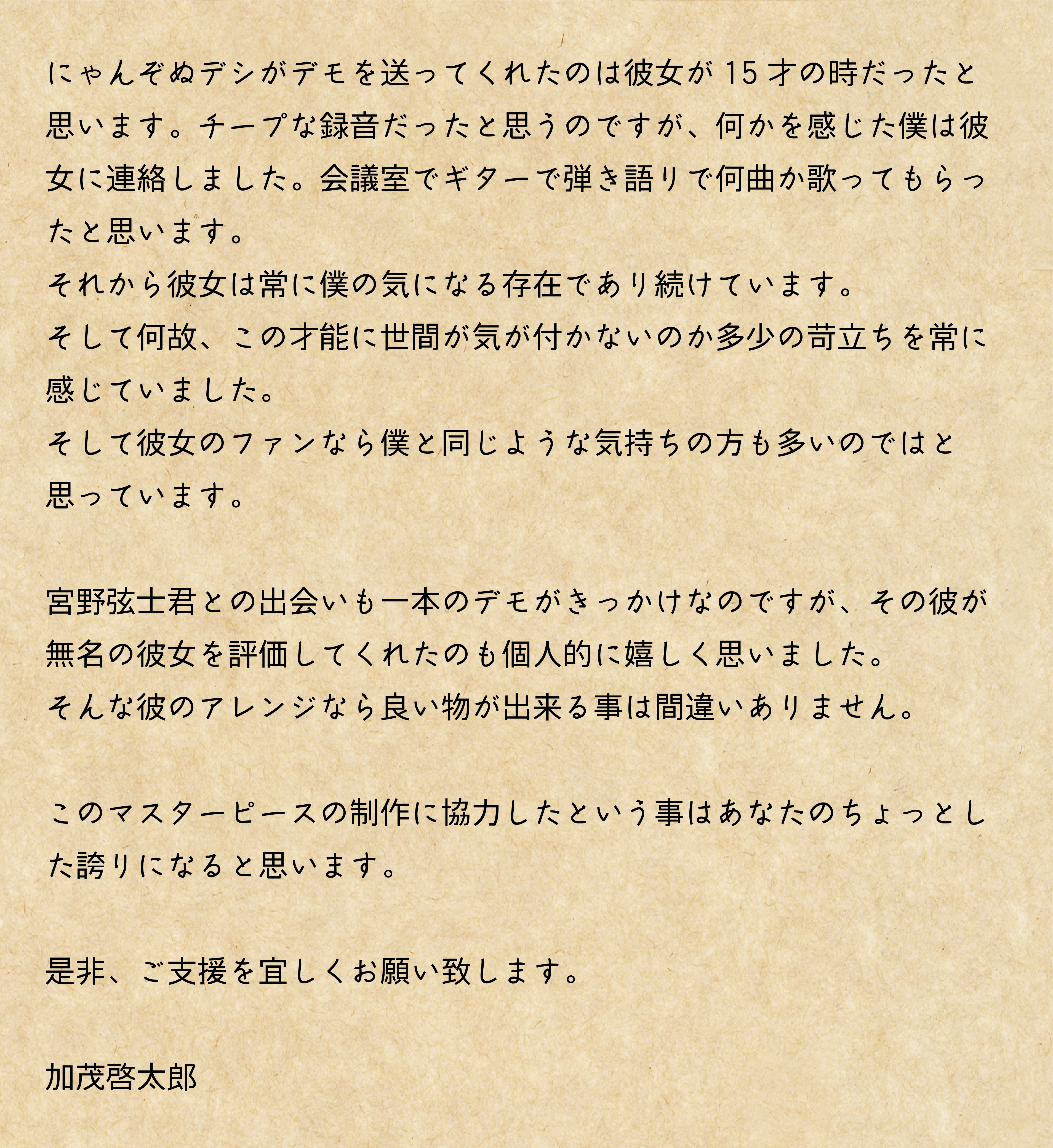 にゃんぞぬデシの音楽を100%ストレートに伝えるためには、宮野弦士さんの協力が不可欠であると感じ、このプロジェクトをスタートさせました。