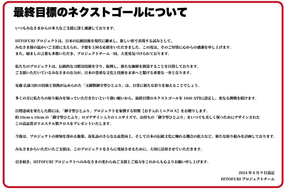 皆様のご支援が、私たちHITOFURIの活動を支え、伝統文化を未来へと繋げる力となります。今後とも、私たちのプロジェクトを応援していただければ幸いです。