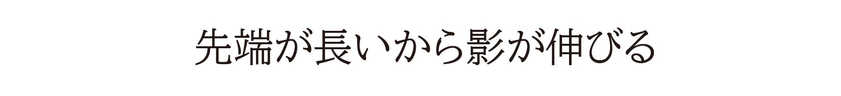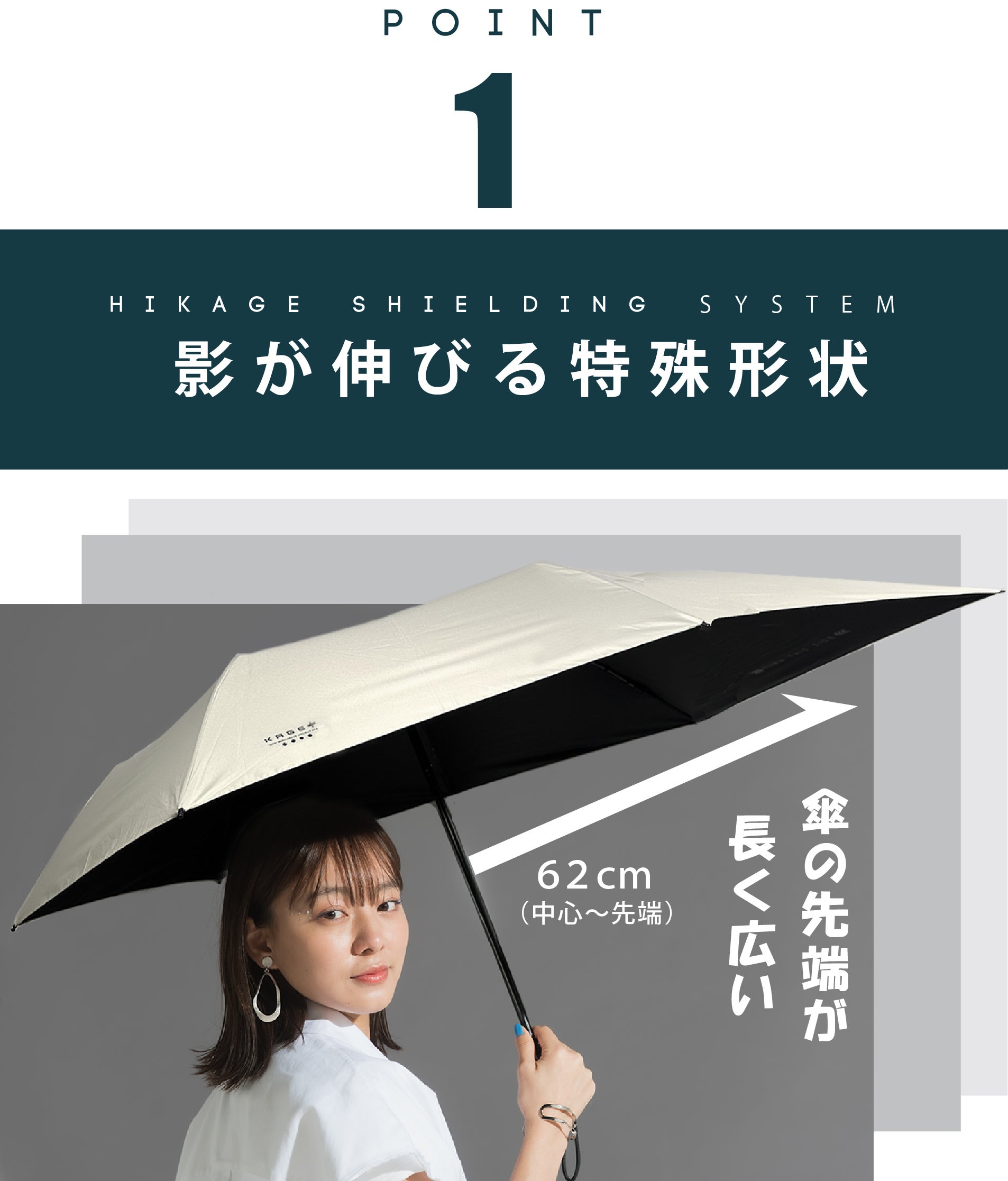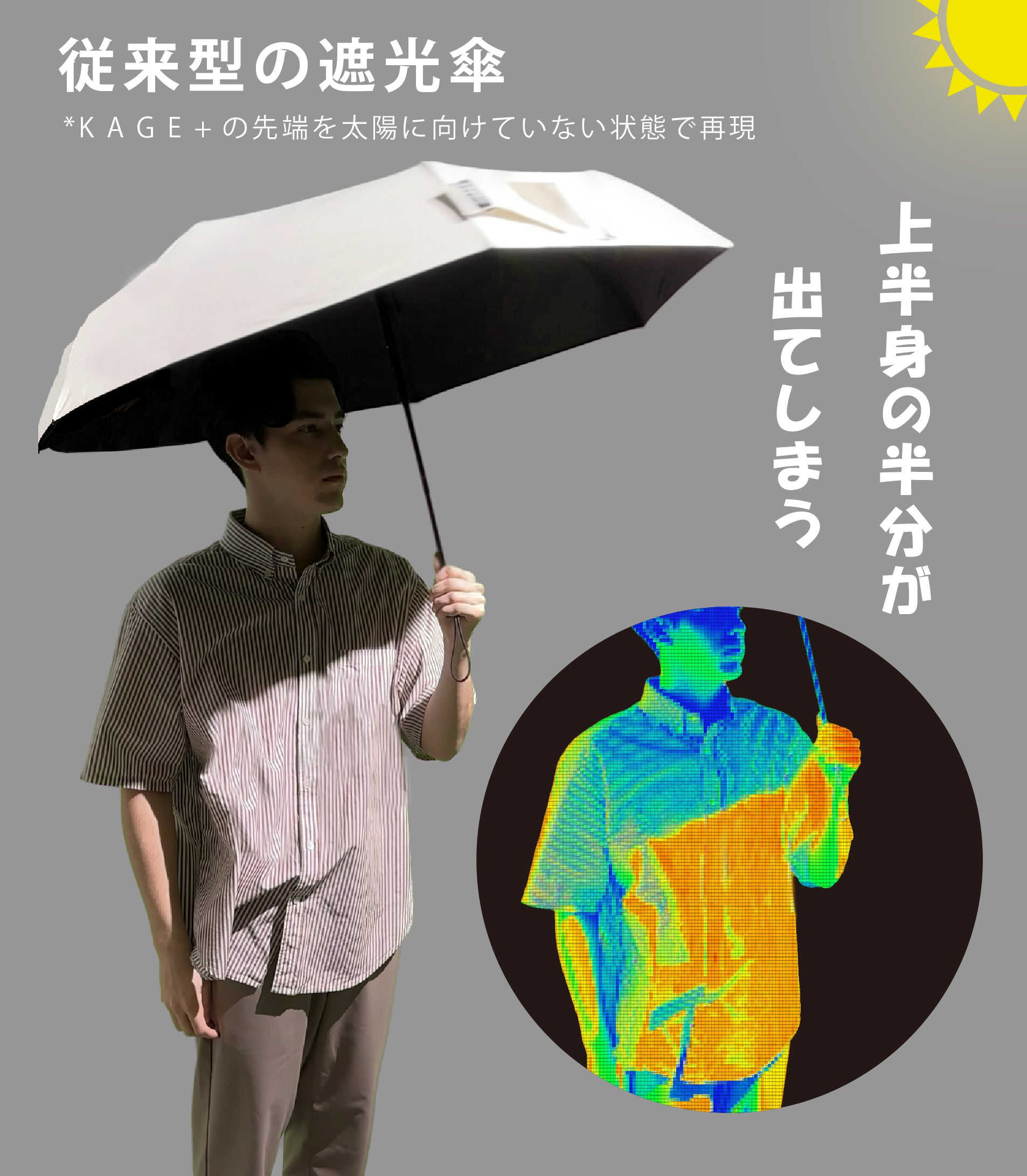 普段日傘を差して歩いていると、前後左右、色んな角度から陽射しは照り付けてきます。KAGE+はその長くて広い先端部分を太陽の方へ向けるだけで、常に広い影を傘の下に作る事ができるのです。