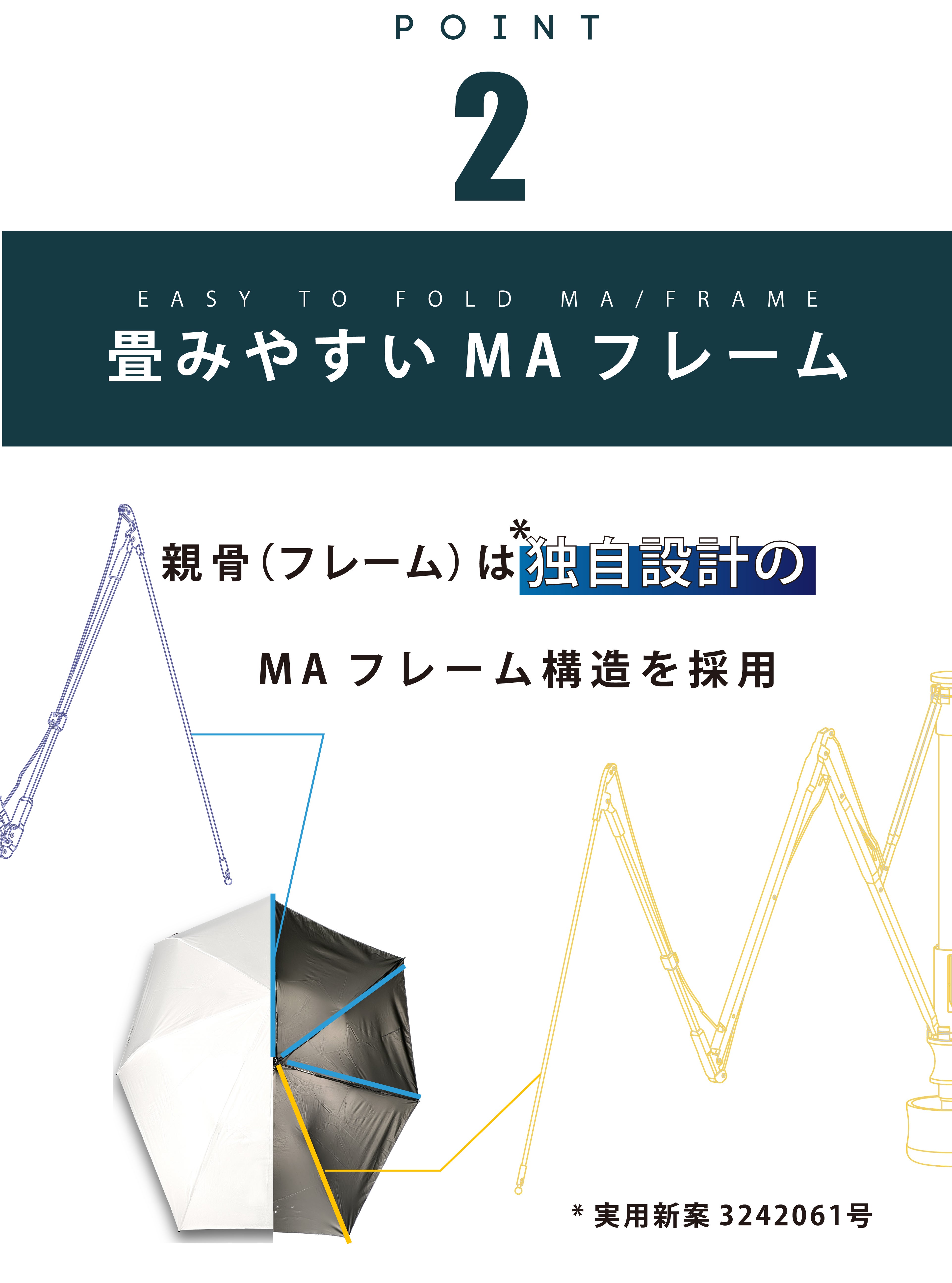 この新型フレームの採用で従来の構造では実現できないような先端親骨が72cmという大型サイズでありながらも290gの軽量化と畳みやすい形状を実現しました。