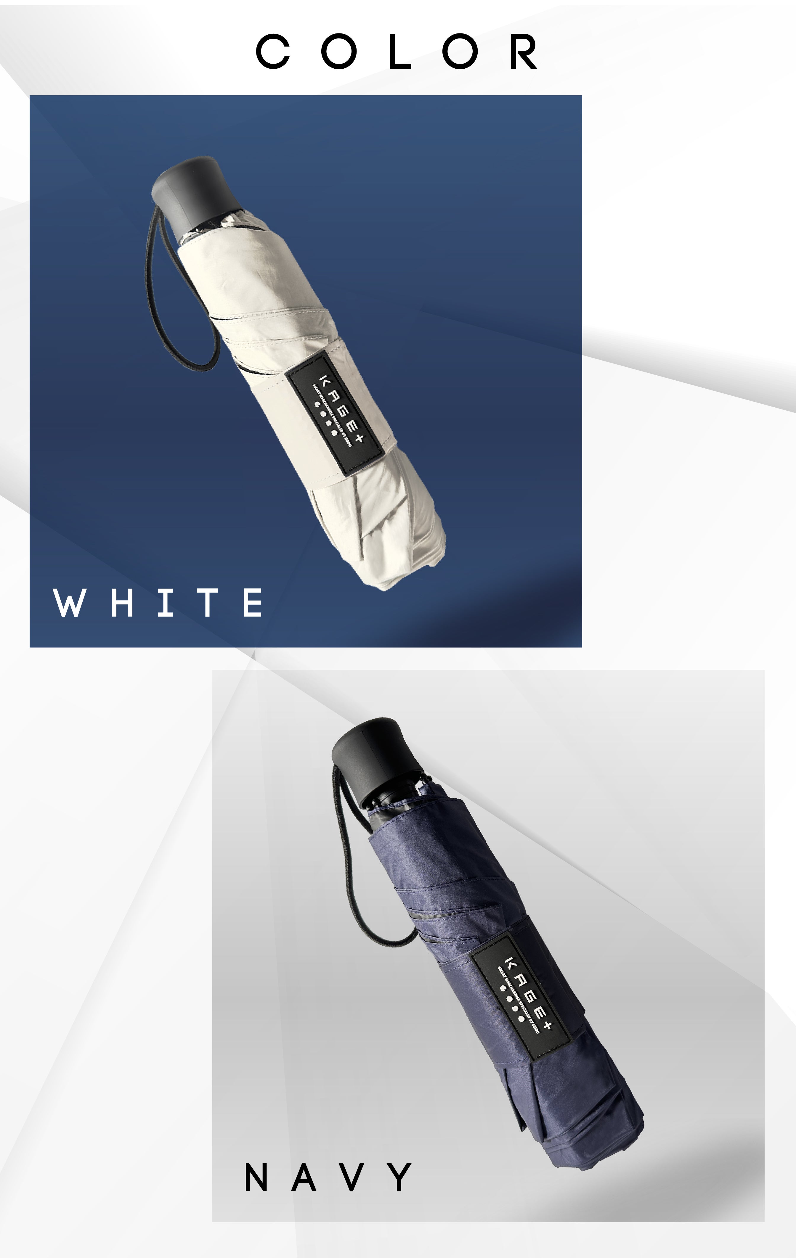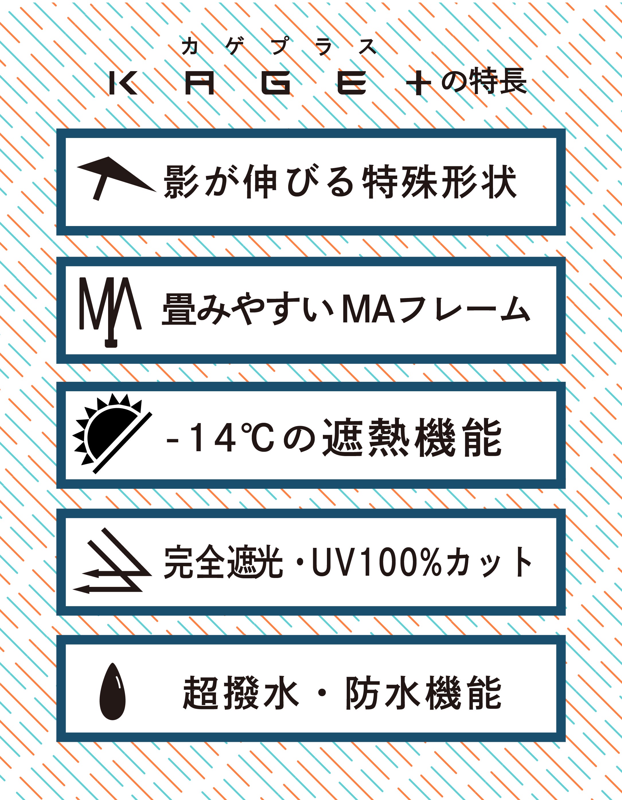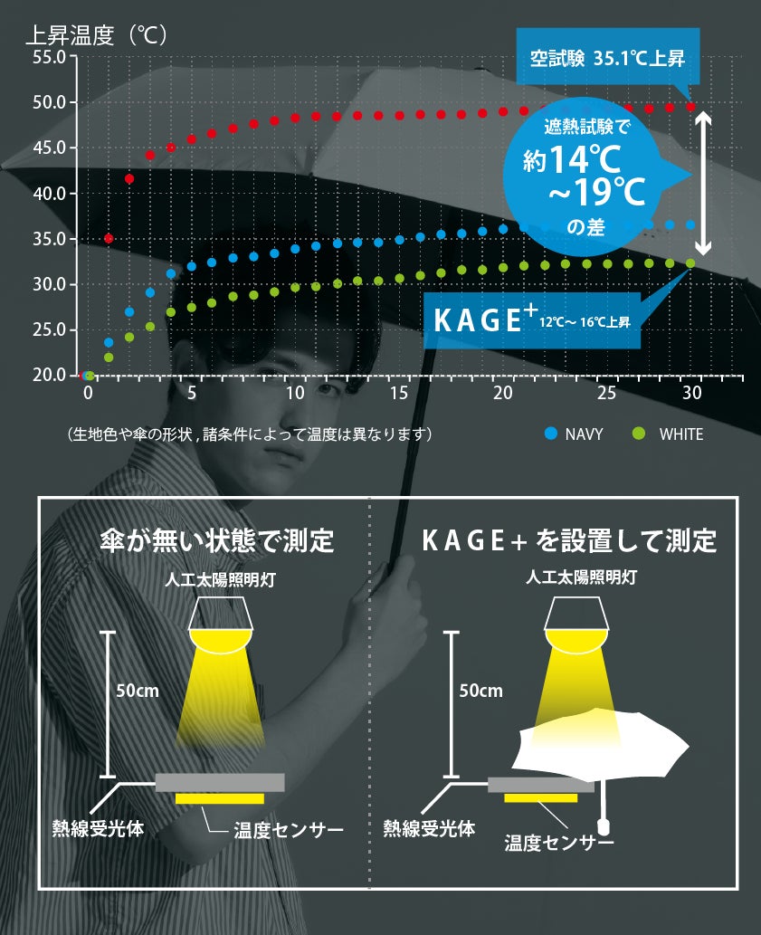 「遮熱効果」を謳う事が出来るのは、一定の熱を遮断する生地を使った傘だけです。K A G E + に使用する生地は30分間のJIS規格の遮熱試験(JIS L 1951)で*マイナス14~19℃の遮熱効果がある事が実証されました。