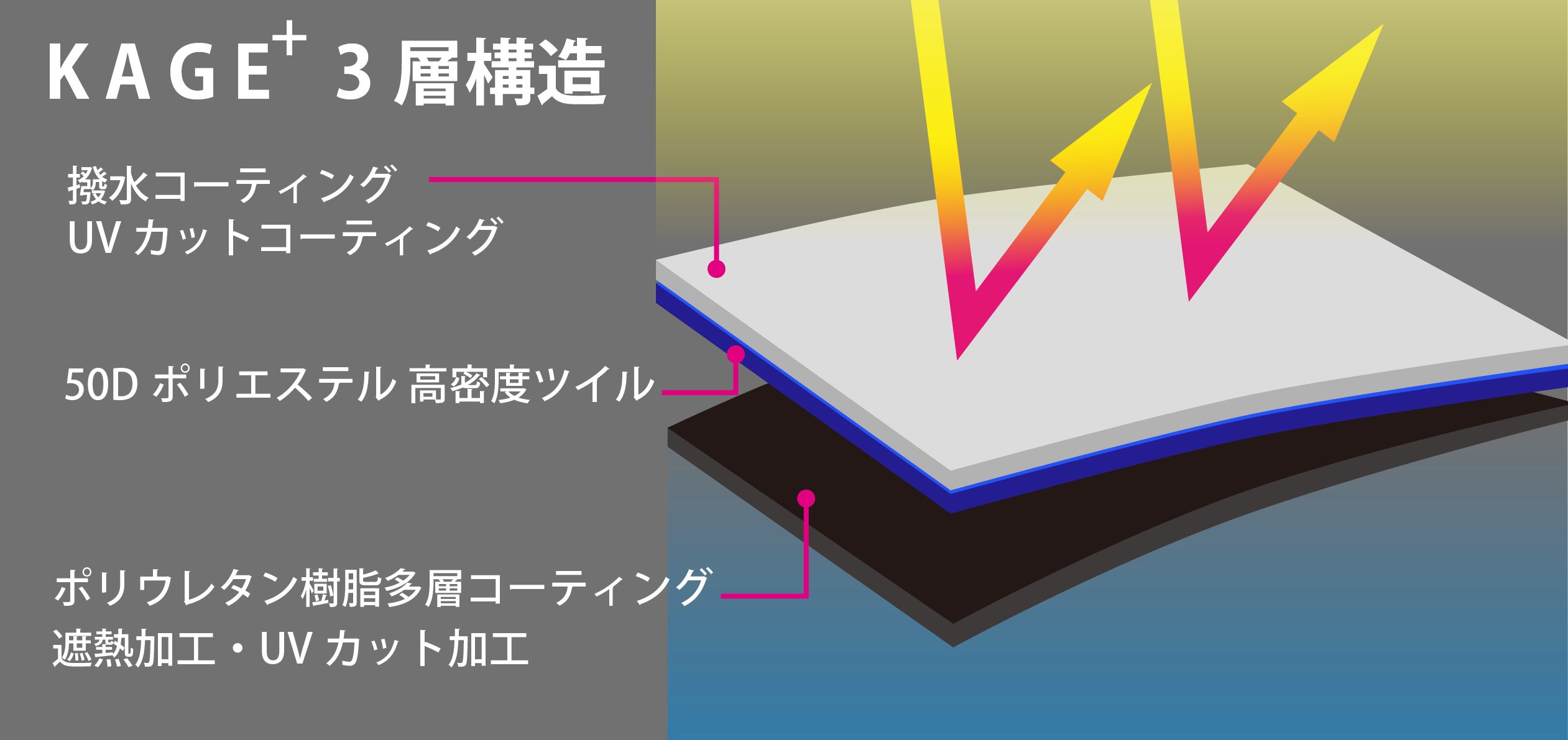 K A G E + は、一般的な日傘で使用されるUVカット処理ではなく、この加工で紫外線や可視光線を100%カットすることを実現しています。