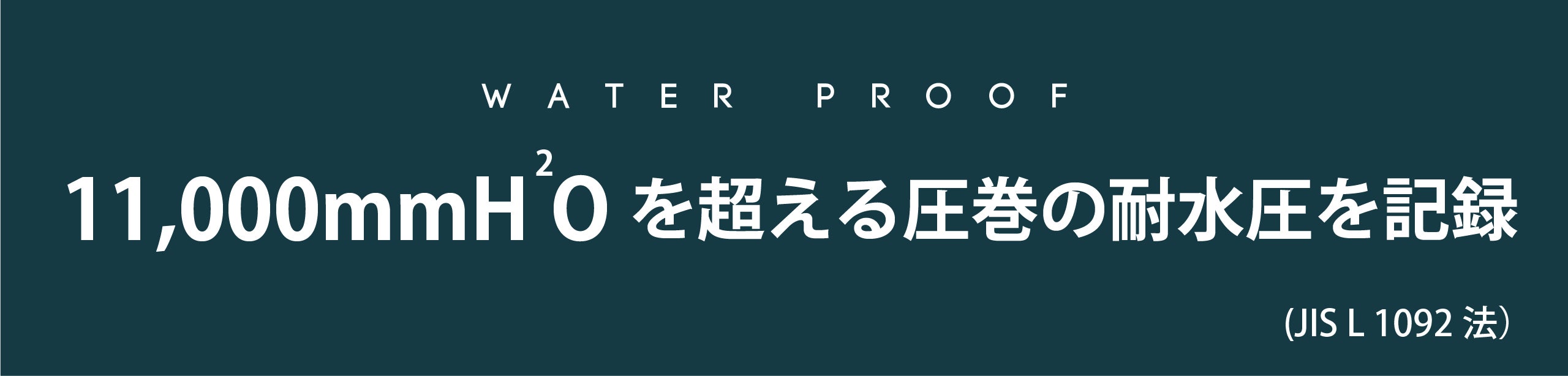 K A G E + の場合、本体生地の裏面に施した多層のポリウレタンコーティングで11,000mmH²Oを越える水圧にも耐えられる特製生地を使用しています。*第三者機関にてJIS規格の耐水性試験(JIS L 1092)を実施しました。
