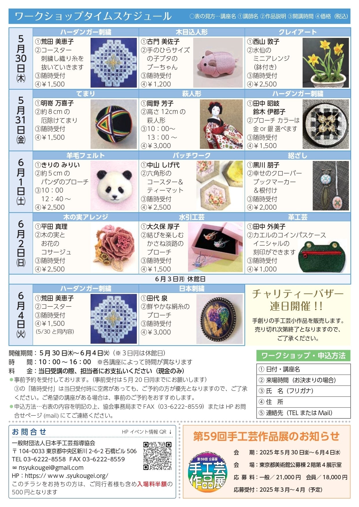 昨年の作品展では「新しい手工芸との出会い」の場をご提供できるように、会場内にてワークショップ(体験講習会)を併催し、ご好評をいただきました。今年も会期中日替わりで、13科目(伝統刺繍や欧州刺繍・てまり・パッチワーク・クレイアート・羊毛フェルトなど)のワークショップを併催予定です。
