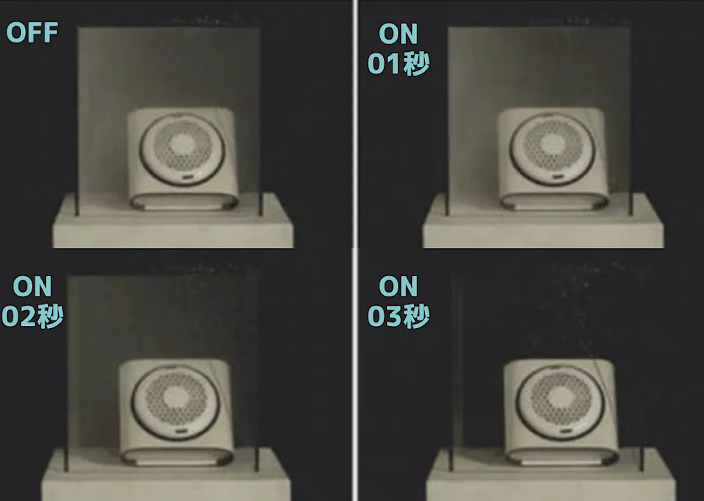 ※空気の流れをみやすくするためにスモークマシーンの煙を使用していますので、実際には白い煙は発生しません。