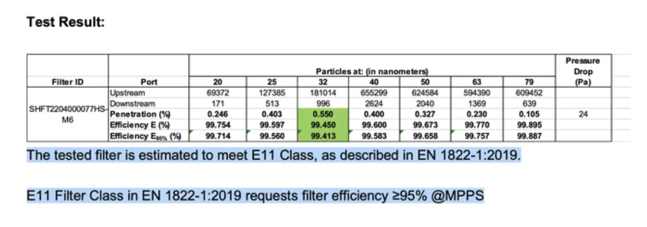 フィルターはEN1822-1規格のE11クラス(フィルターが吸収する粒子の吸収率が95%以上)に規準すると証明されています。