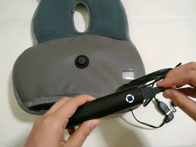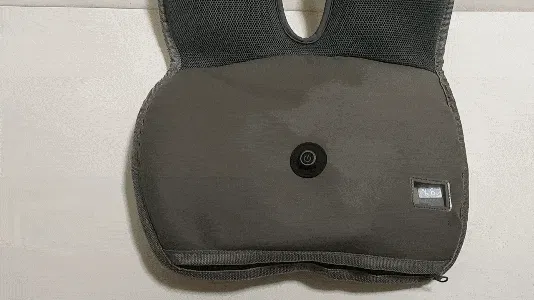 シート本体にある電源ボタンを押すことで弱(緑色)・中(青色)・強(赤色)の風量に調整が可能で、液晶画面にバッテリー残量が表示されます。