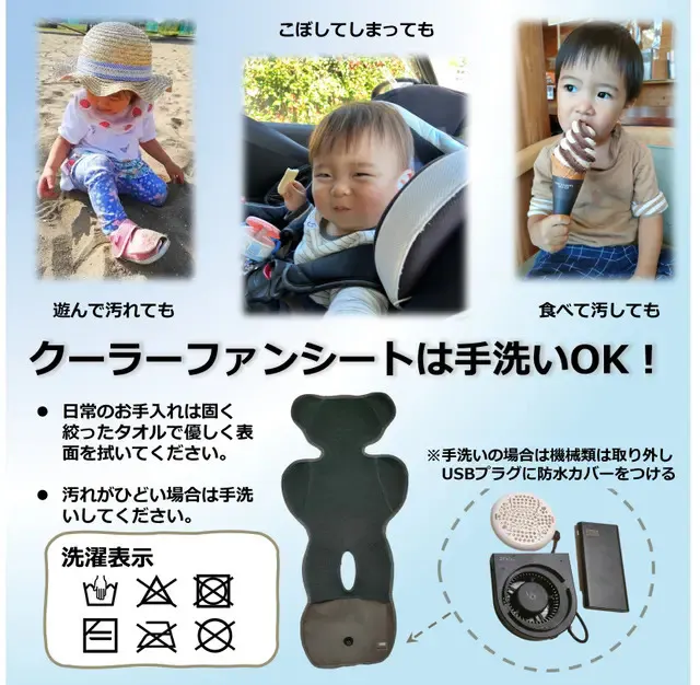 いっぱい遊んで楽しい思い出をつくってほしい願いから、TAOTAOクーラーファンシートは“洗える”ことも重視しています!