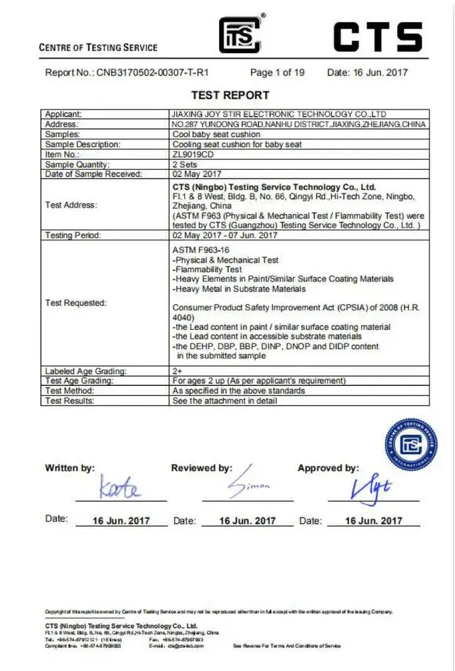 米国消費者製品安全委員会が認定する第三者機関による適合試験に合格し、商品が子供向け製品として安全に使用できることが立証されています。