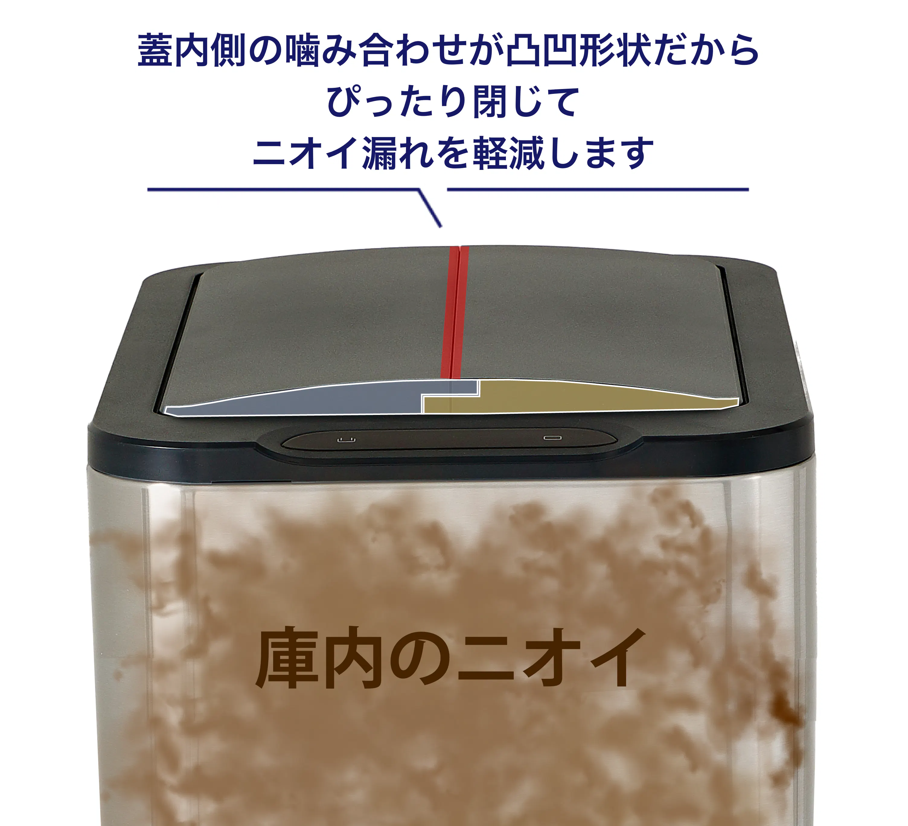 さらに、フタと本体の左右の接触部分が凹凸形状に嚙み合わさることで、結合部のスキマから臭いを漏らしにくい設計です。