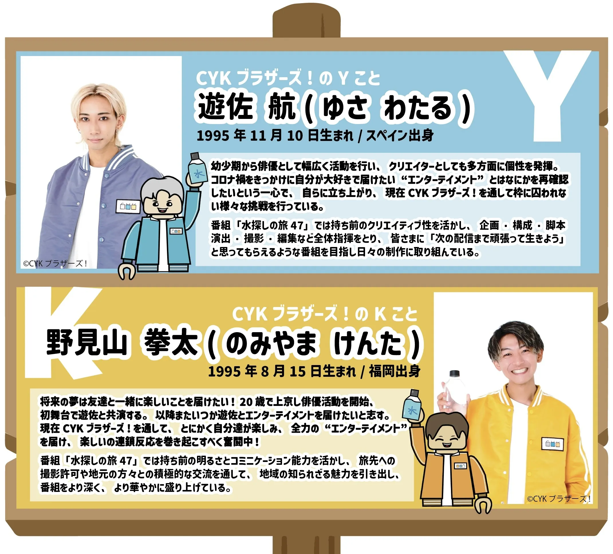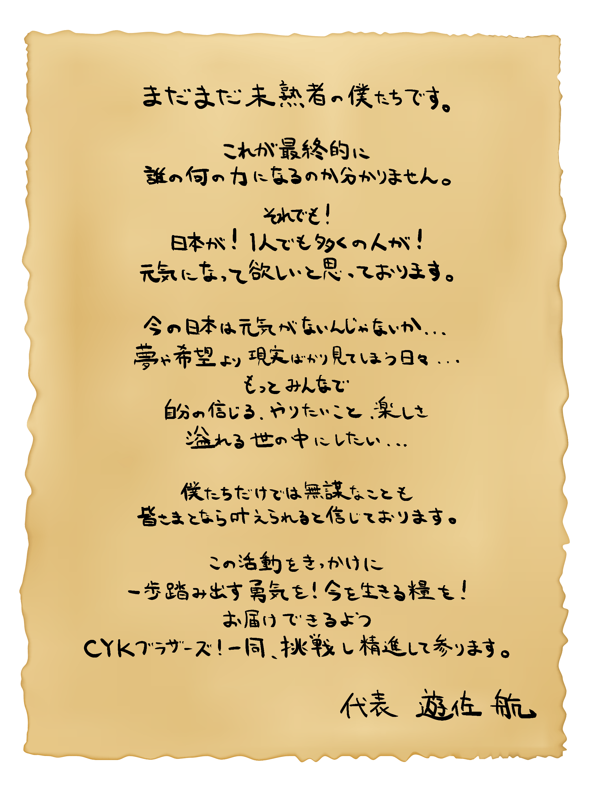 エンタメがもつ力に魅了され、俳優として各々で活動を行っていた僕たち。コロナ禍の中、それぞれが自分達の不甲斐なさを痛感し、このままでは…と奇遇にも同時期に所属事務所を退所。一度共演をした以来、再共演はなくとも交友が続き、親友と呼び合う仲だった僕たちは、引き合うようにして、自分達の大好きな"エンターテイメント"を再確認し合い、皆さまに楽しんでいただける"自分たちのエンタメ"を届けたいと考えるようになり、紆余曲折あり2024年1月1日より《CYKブラザーズ!》として活動を開始しました。