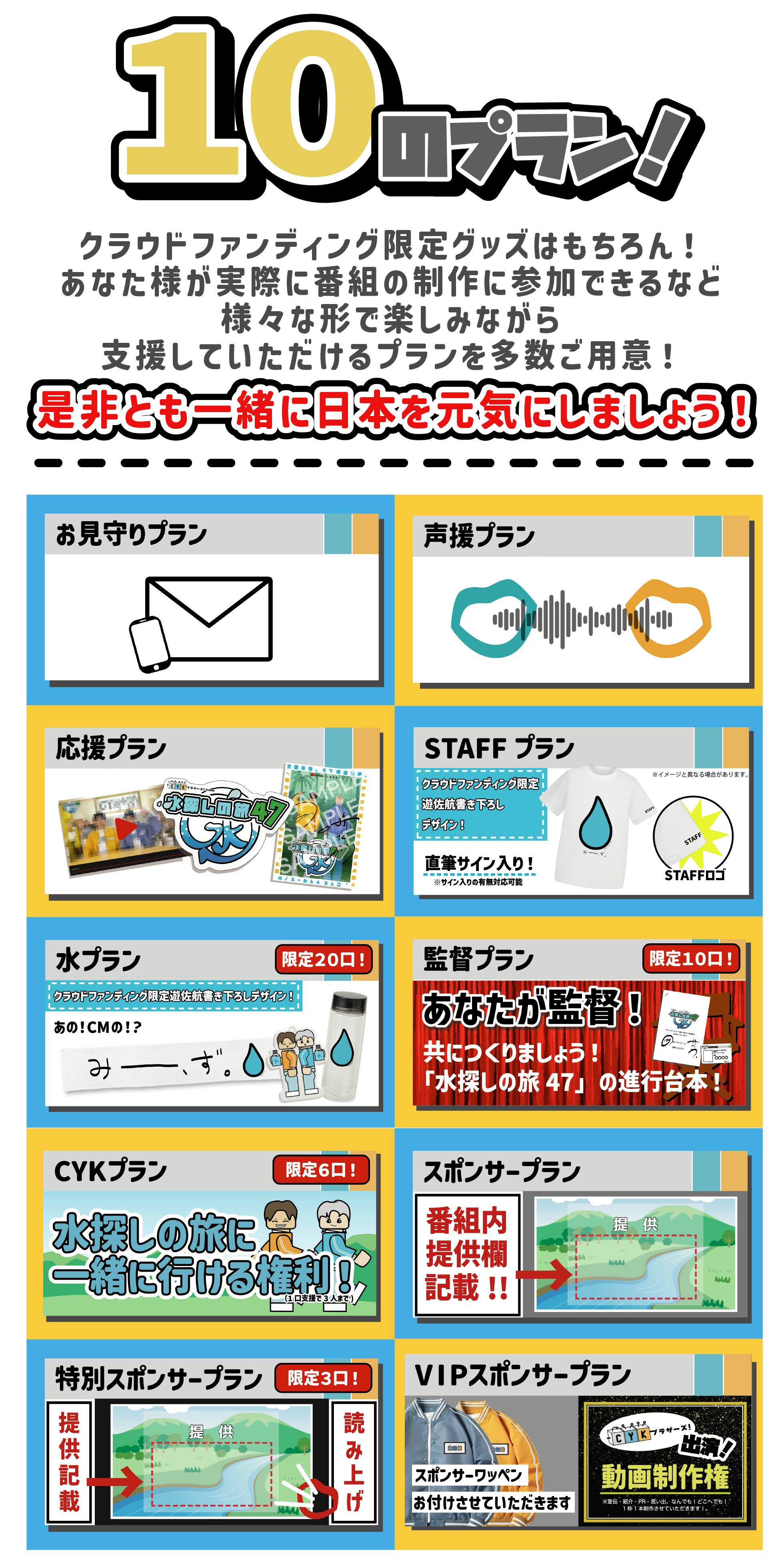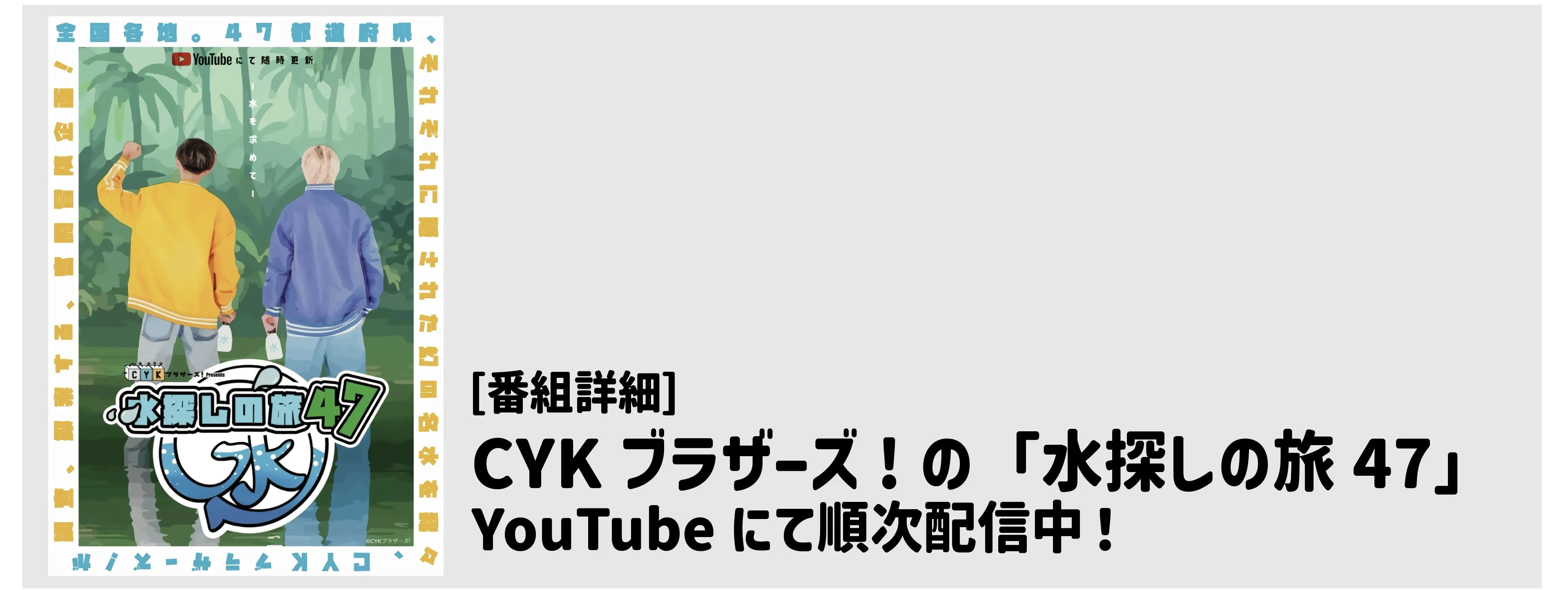 全国各地。47都道府県、それぞれに隠された幻の名水を我々CYKブラザーズ!が調査、探索、探し求めていく奮闘冒険企画番組!その名も…