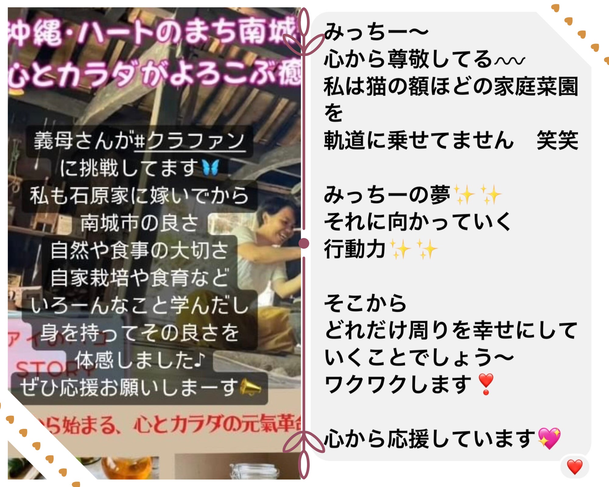 2024/06/14 16:09こんにちは!はるさーミッチーです♪沖縄は連日降り続く大雨でナスと島カボチャを育てている畑は何度も水没しています(>_<)農業は自然と共にある仕事なので、これも受け入れて前に進んでいきます!「自然順応」「自然尊重」ですね。さて、私たちのプロジェクトがスタートして本日で5日目になります!たくさんの応援メッセージ、ありがとうございます♪SNSや個人メールにも嬉しいメッセージが届き、すごく励みになってます(画像参照)本当にありがとうございます!<現在のプロジェクト進捗状況>◇◇◇◇◇◇◇◇◇◇◇◇◇◇◇◇◇◇◇◇◇◇◇◇目標金額は2,000,000円現在の支援総額200,000円(10%)(>_<)残り37日(目標達成まで1,800,000円)◇◇◇◇◇◇◇◇◇◇◇◇◇◇◇◇◇◇◇◇◇◇◇◇とても良いプロジェクトだと自信を持ってスタートしました!(今でも思ってます)しかし、現段階では思うように支援が伸び悩んでいるのが現状です(>_<)色々反省点もありますが、プロジェクトスタートした今、私たちに出来ることは、少しでも多くの方にこのプロジェクトを観てもらえるよう、SNSやこちらの活動報告にて最後まで伝え続けたいと思います♪プロジェクトをご覧いただき、共感して頂けたらぜひ、ご支援ヨロシクお願いします!私たちが創る『アイのハコ』は、私たちから子育て世代へ。そして、未来のこどもたちへ繋がる場所になると思っております!私たちと共に、場所づくりにぜひ参加してくださると嬉しいです♪ もっと見る