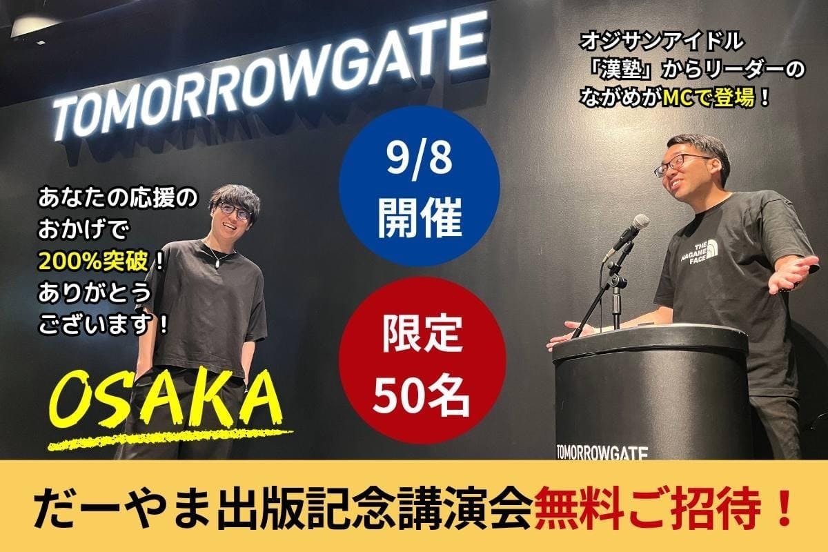 200%突破と出版を記念し、大阪で出版記念講演会と懇親会を開催させていただきます!