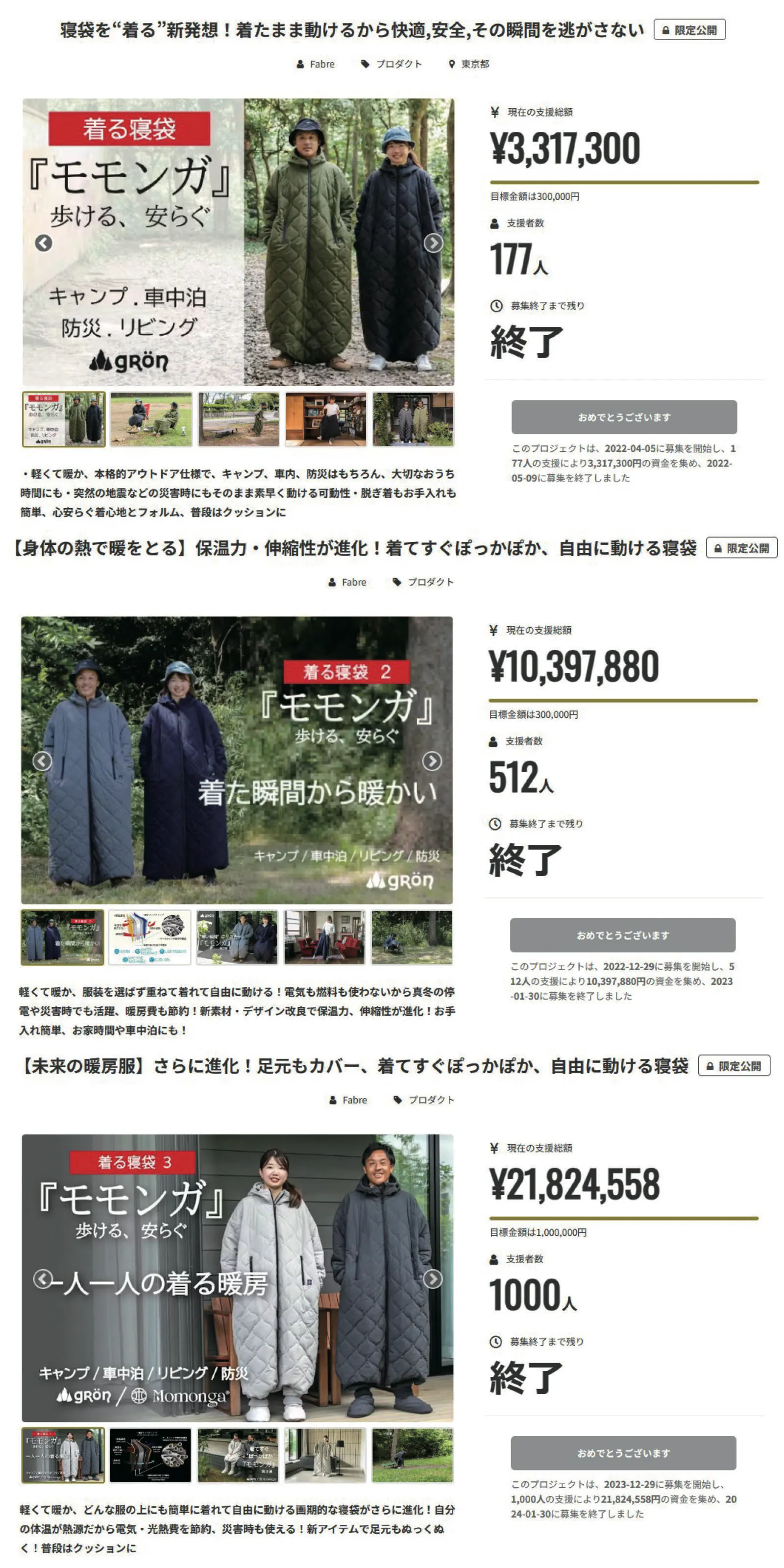 第1弾「モモンガ」では支援者数177人、達成率1105%、第2弾「モモンガ2」では支援者数512人、達成率3465%、第3弾「モモンガ3」では支援者数1000人、達成率2182%と多くの反響をいただくことができました。本当にありがとうございました。