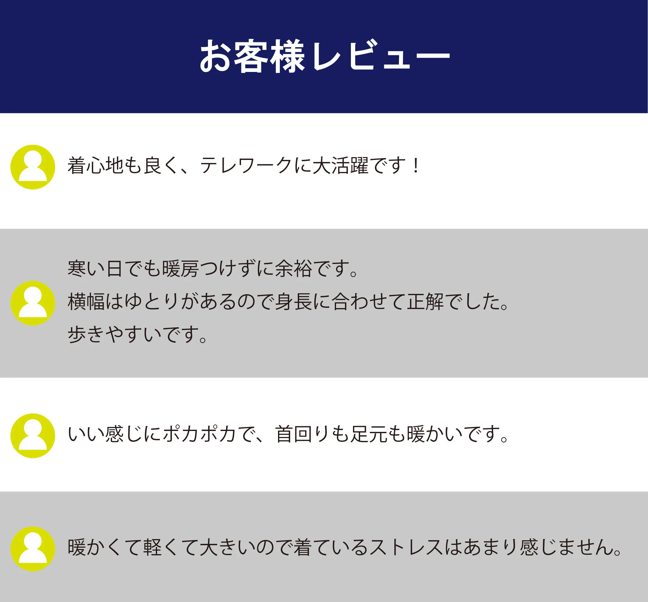毎年10月から3月頃までの1年の約半分の期間で、日本人の約6割、男性約4割、女性約8割の方が寒さにお困りです。寒さを解消することで心まで元気に温めてくれます。