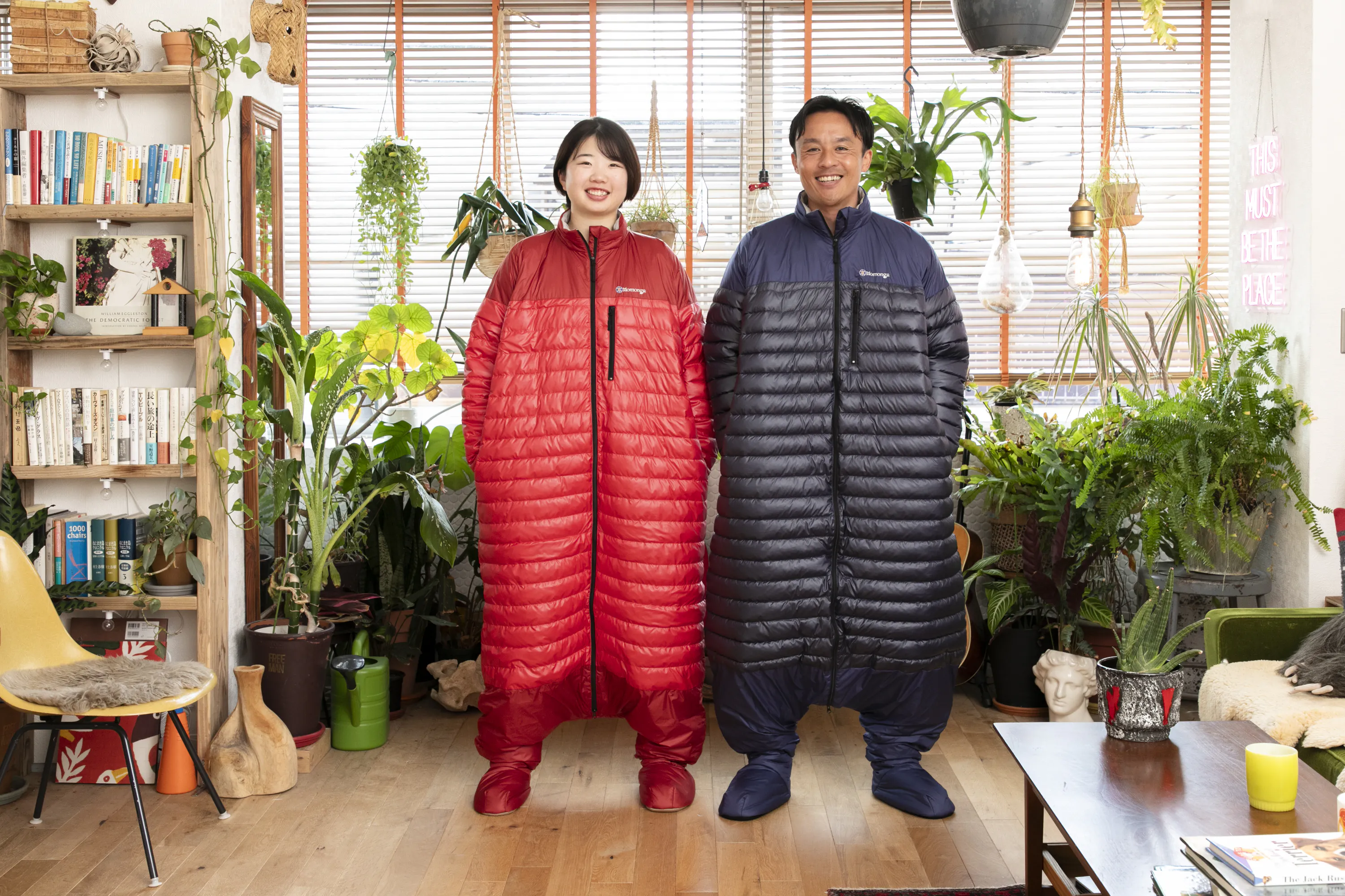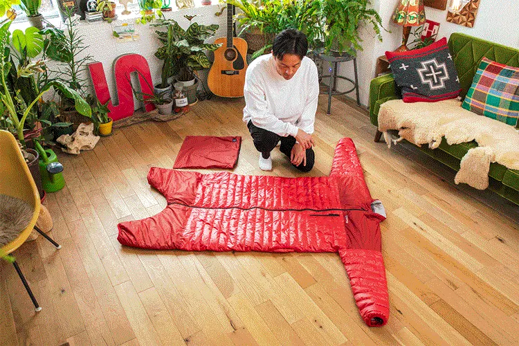 「モモンガ」は寒さを感じた時にどんな服の上にもサッと着れてすぐに暖かさに包まれ自由に動くことができる画期的な寝袋です。