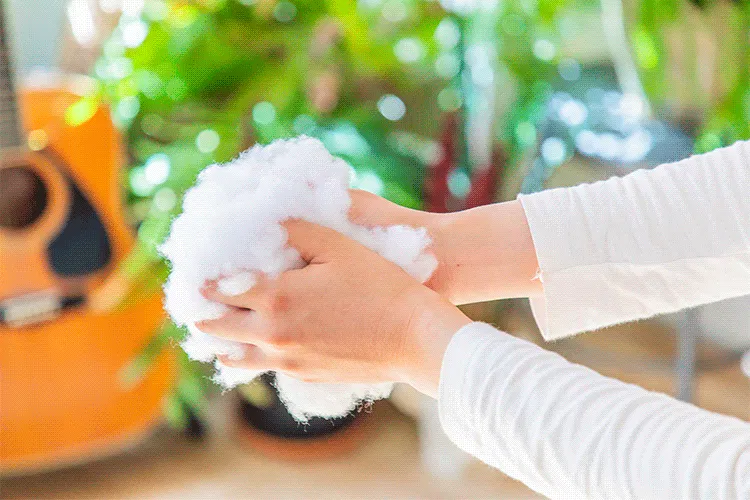 洗濯機による中綿の抜けを防ぐため、30Dタフタを使ってダウン製品と同じ製法で中綿をパックしています。これにより中綿の飛び出しを防ぎます。
