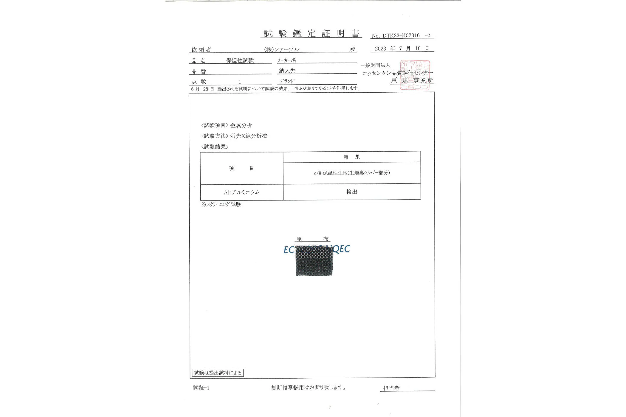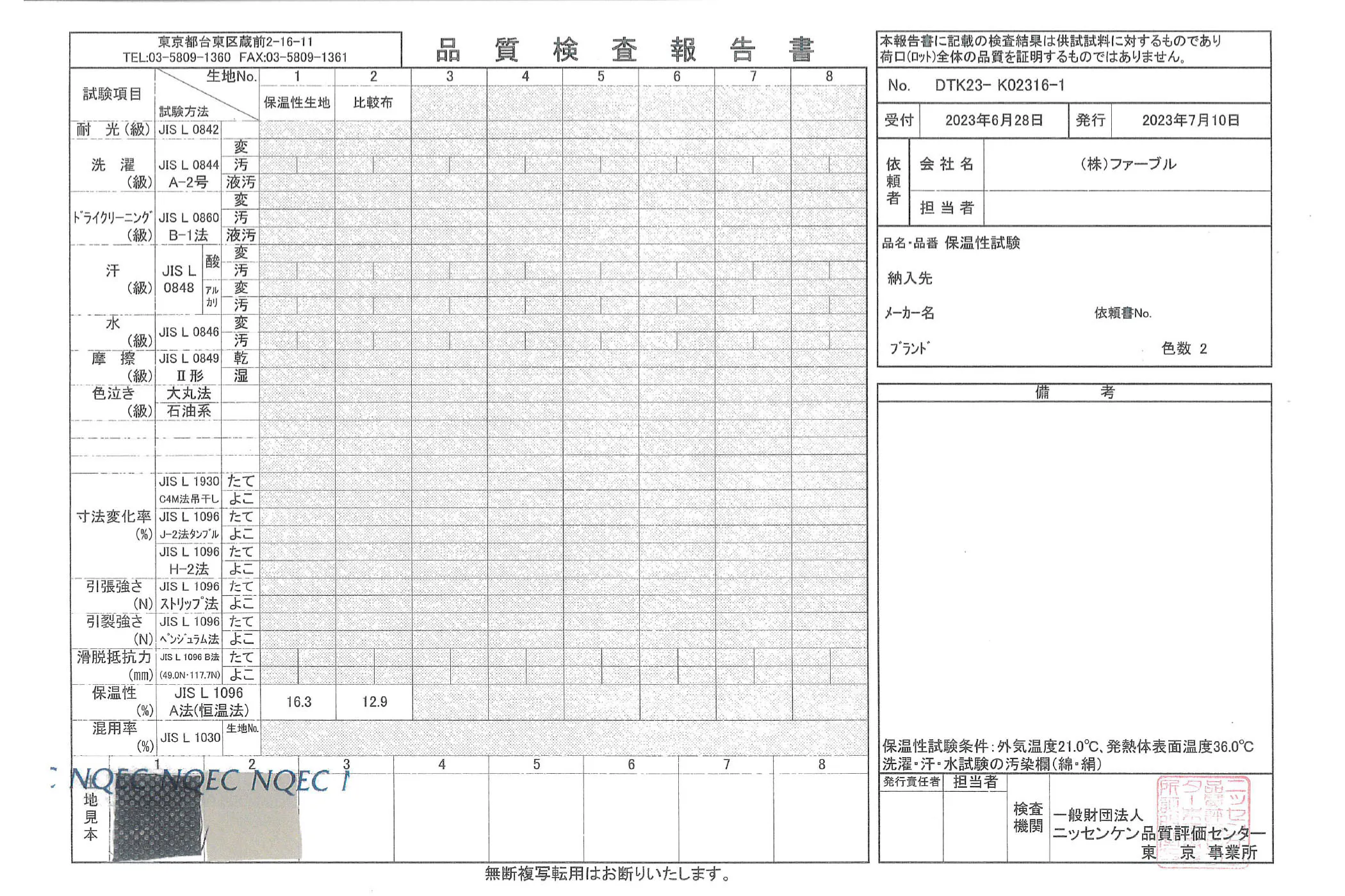 JIS L 1096 A法(恒温法)の保温性検査で弊社比較品より約124%保温性の向上が確認されました。