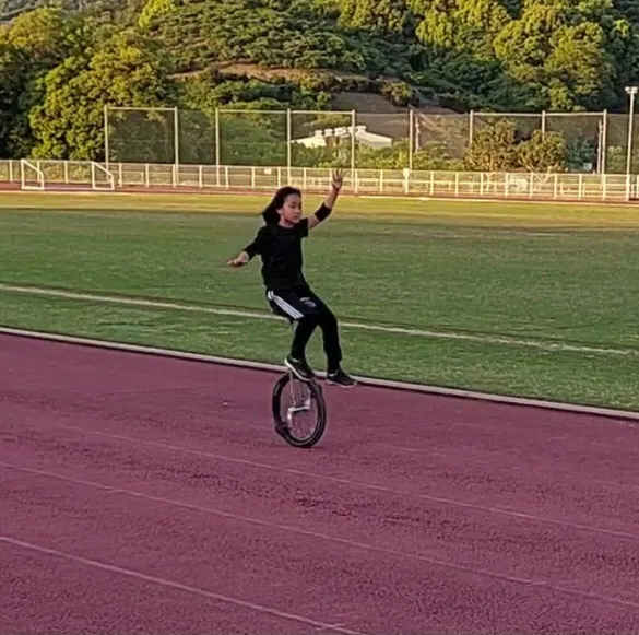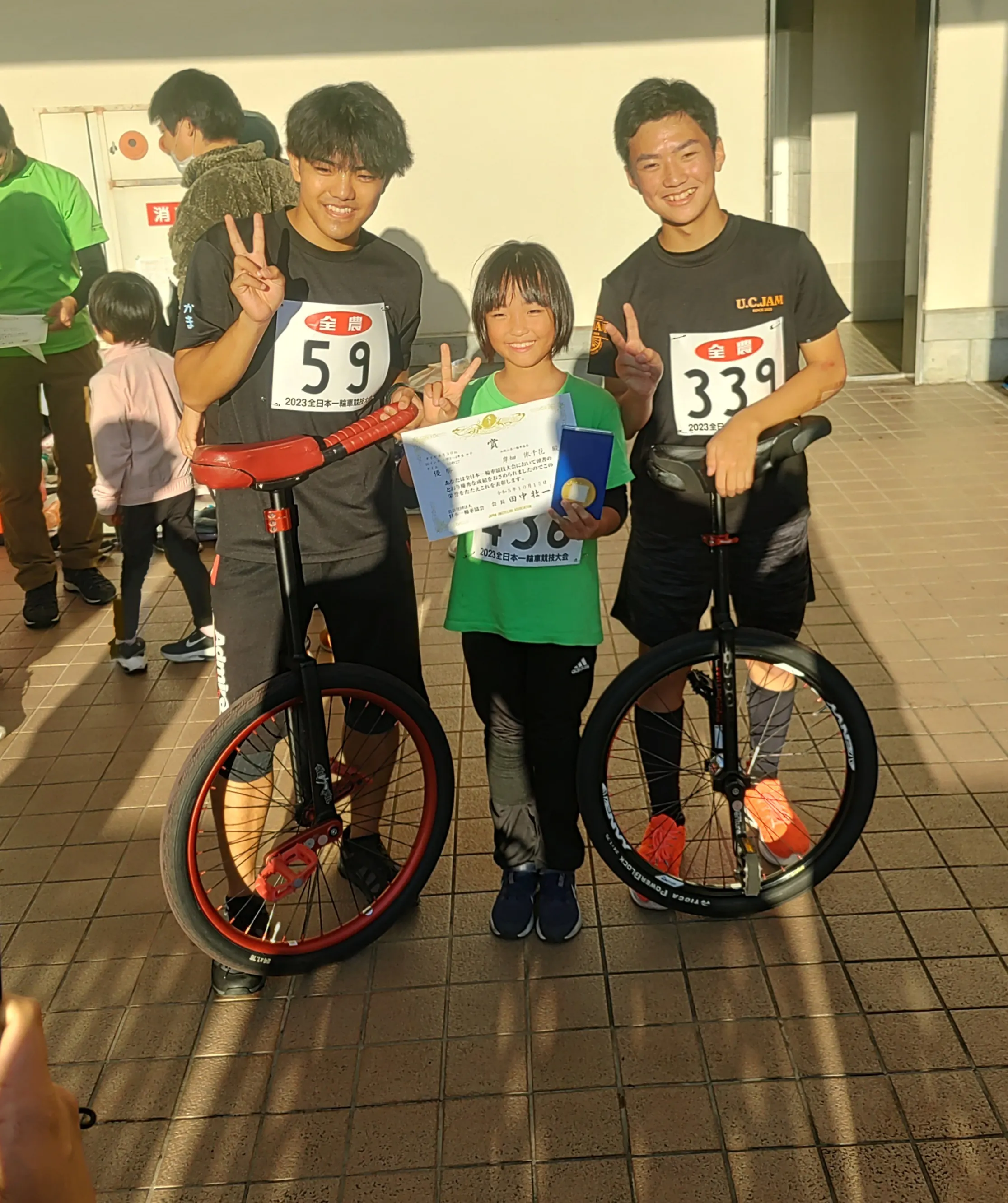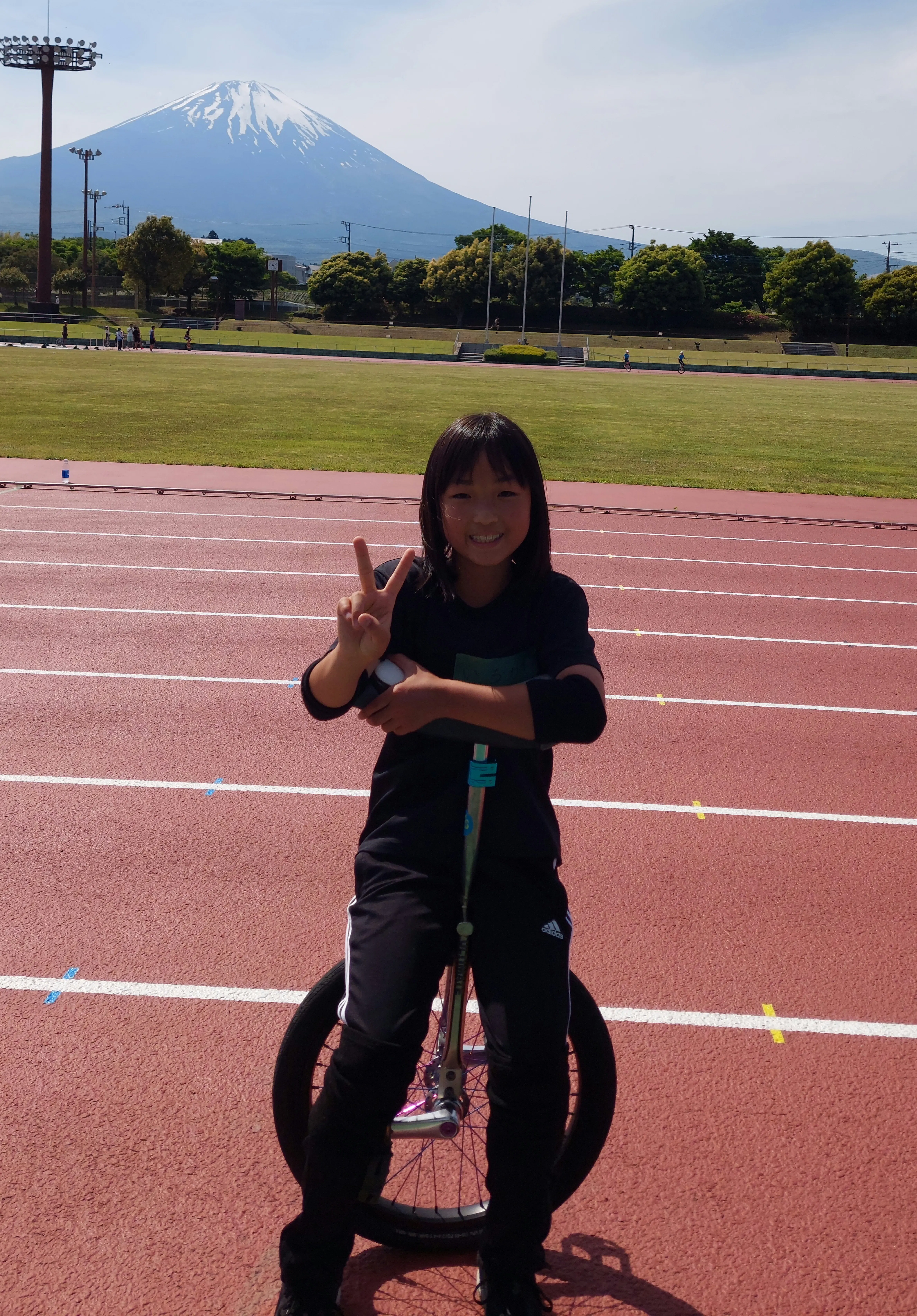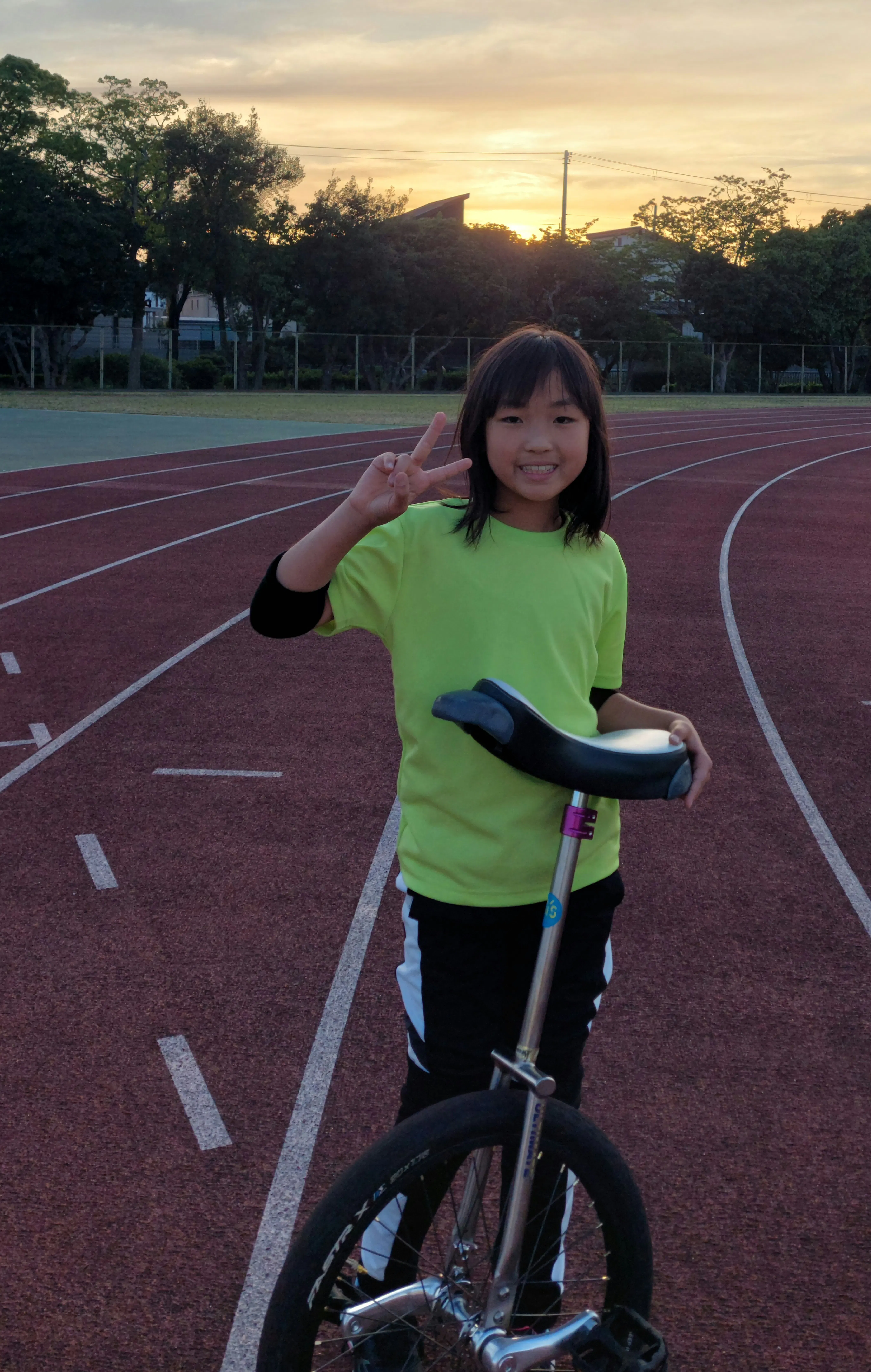 私が一輪車に初めて乗ったのは小学一年生。友達と一緒に乗るのが楽しくて毎日乗っていました。一輪車は、1人でもみんなと一緒でもできるのが、私にとって1番の魅力です。地元のクラブに入りいろんな競技があるのを知り、ライバルと一緒に練習して競うのが楽しくて大好きになりました。競い合う中でタイヤ乗りが得意だとわかり、全日本大会にむけて過去の大会記録を調べてもらいました。目標タイムがわかり、夢中で目標タイムを目指し練習すると、タイムが速くなりましたが、途中でタイムが伸びなくなり悩んでいたら、Instagramでタイヤ乗りが速い選手を見つけ、お父さんにDMを送ってもらいました。私のタイヤ乗り動画を見てもらいアドバイスをもらうと、そこからタイムが速くなっていきました。ドキドキしながら本番の2023年全日本トラックレース大会、タイヤ乗り競技で優勝しました。アドバイスをくれた選手に優勝を伝え、記念撮影してもらい嬉しかったです。世界大会というより大きなステージで私の技術を試したいです。
