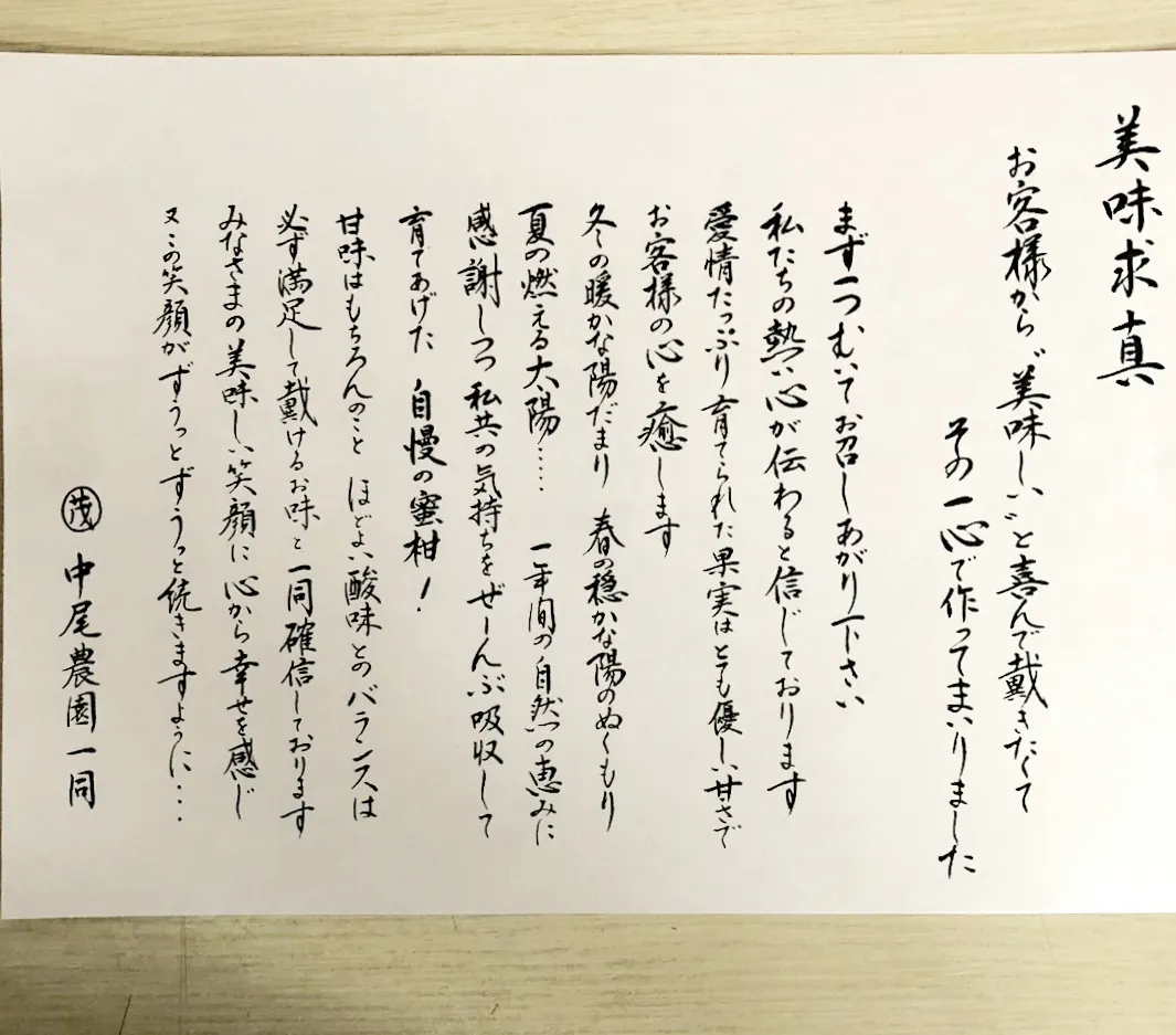 和歌山県ならではの物がいいと思い、みかん農家さんと苺農家さんに、相談すると協力してもらえました!和歌山県みかん発祥の地とされる下津。中尾さんちの高級みかんです。160年の歴史があり、研究を重ね(長い歴史と今を融合している農園です)愛情たっぷりに育てたみかんは甘味はもちろん酸味とのバランスが絶妙です。生産者の中尾農園の方々です。