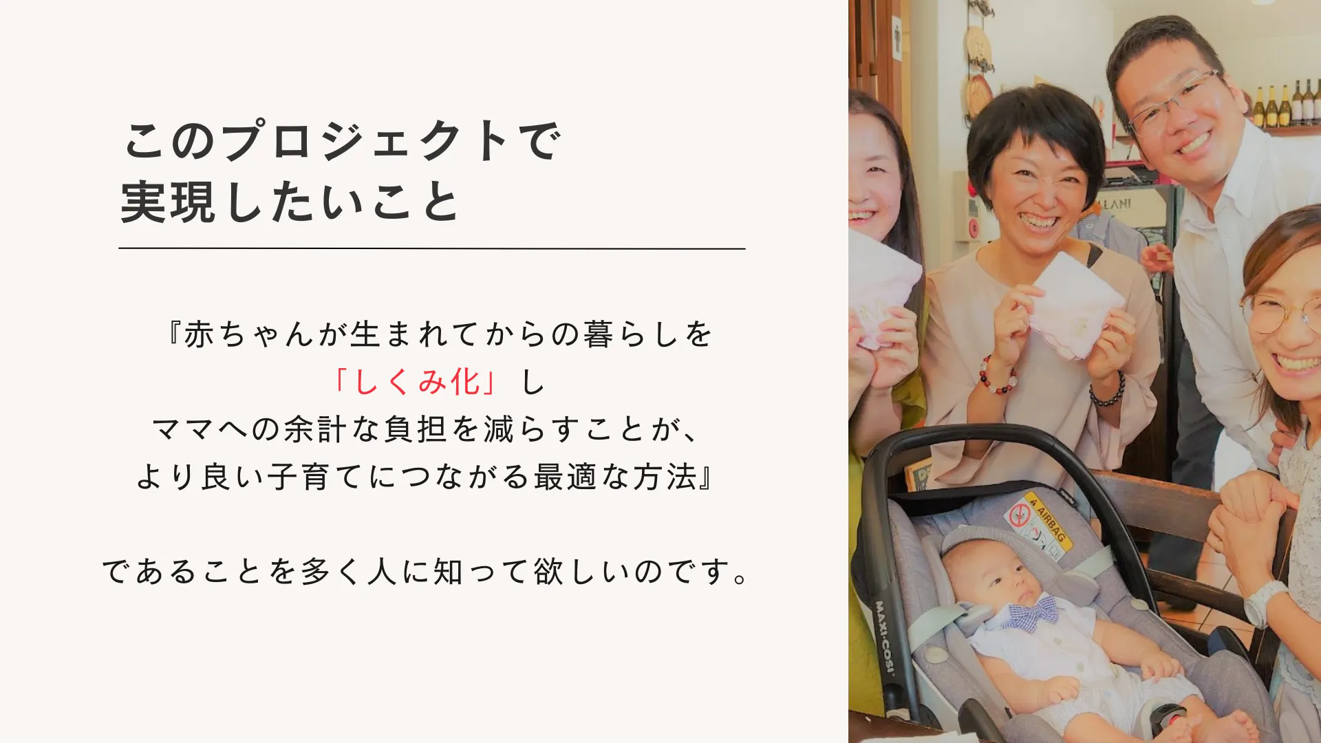 『妊娠~産後にまつわる体や心、赤ちゃんとの生活に関わる正しい情報』 を多くの人に知ってもらうとともに、『ご家族が産後の暮らしを整える、仕組み』をつくること